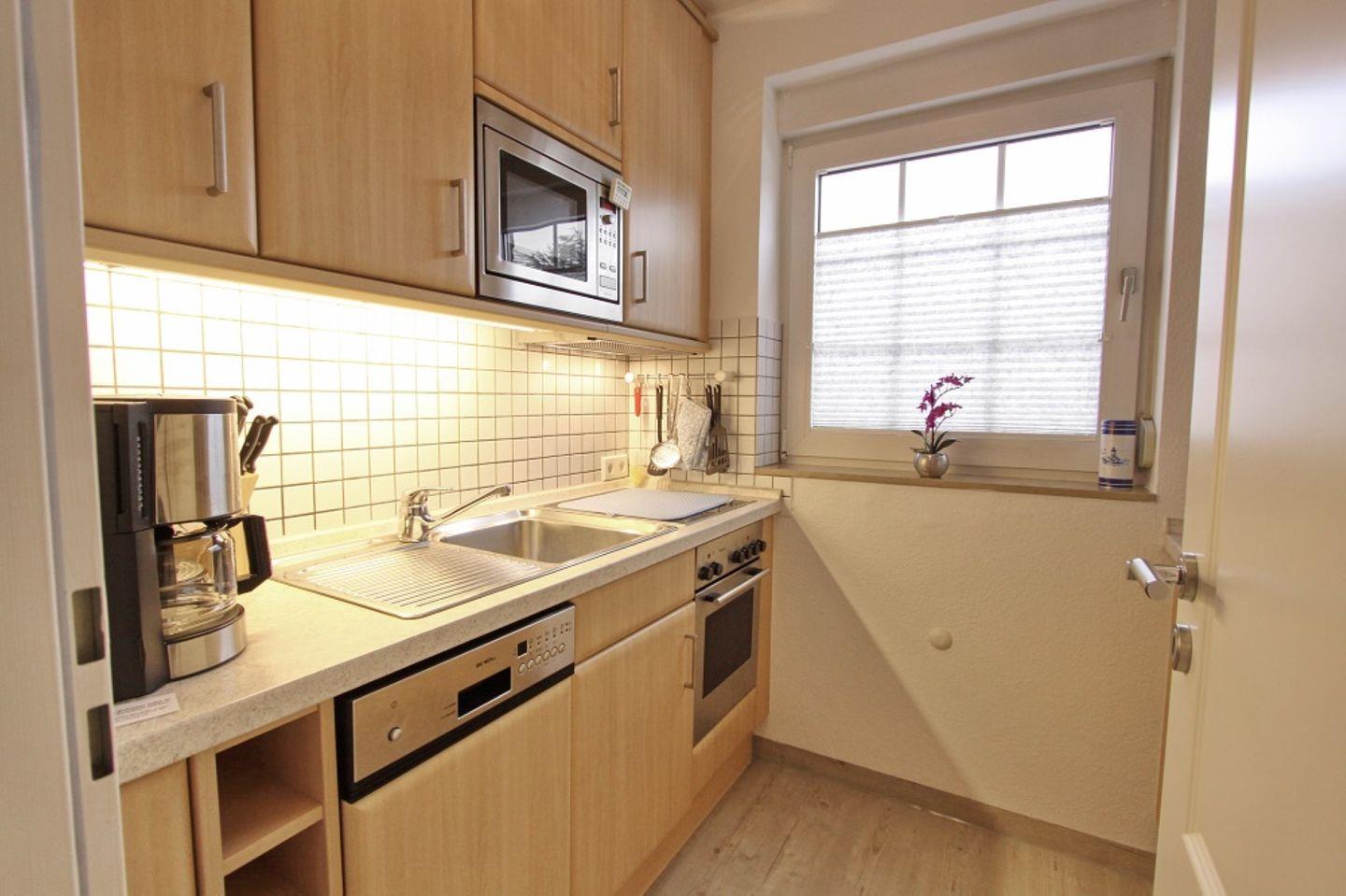 Diese ist voll ausgestattet mit einem Cerankochfeld, Backofen, Mikrowelle, Geschirrspüler, Kühlschrank mit Gefrierfach, Wasserkocher, Toaster und Kaffeemaschine.