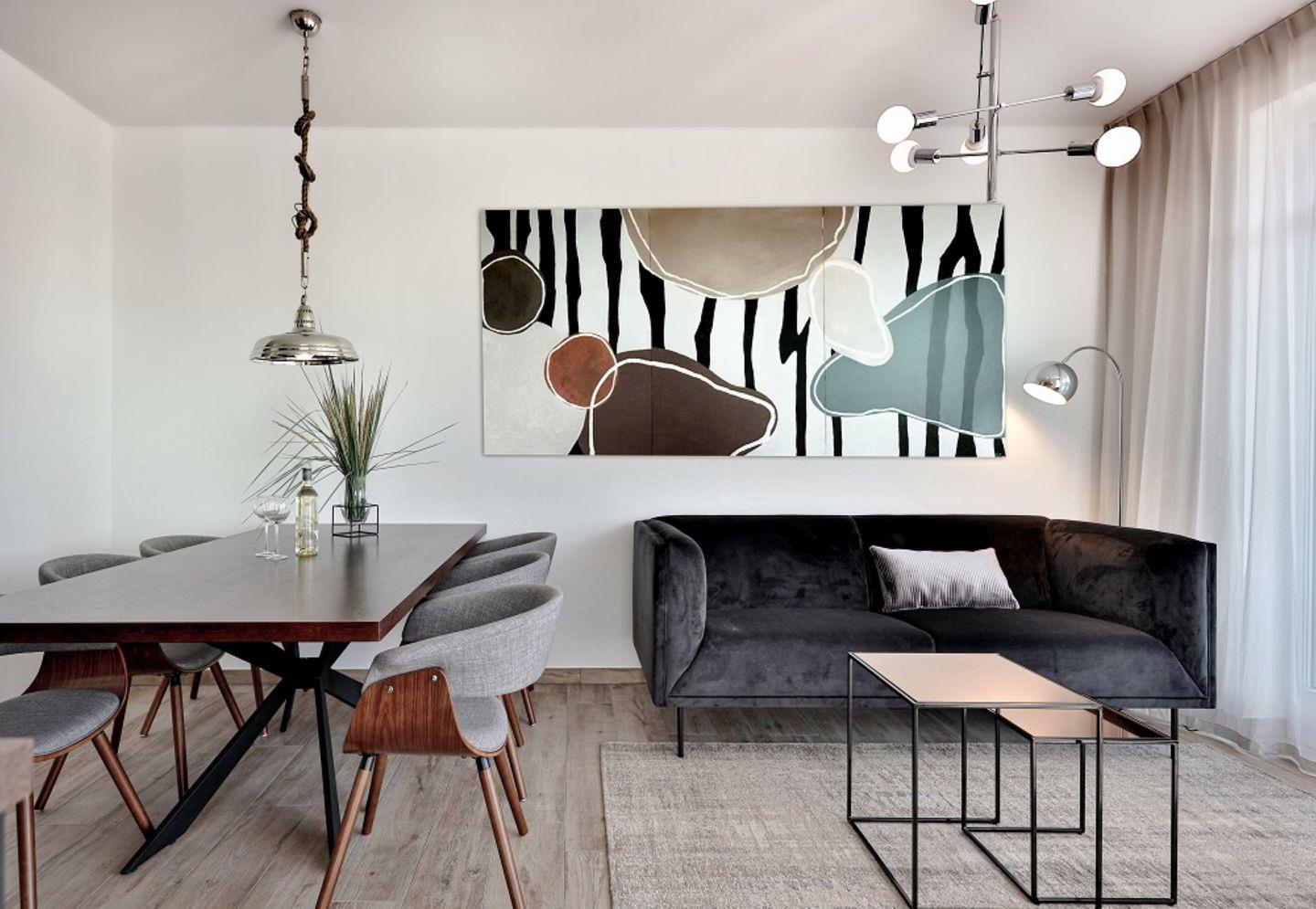 Das Wohnzimmer bietet aufgrund seiner bodentiefen Fensterflächen und offenen Architektur ein lichtdurchflutetes und großzügiges Raumgefühl.