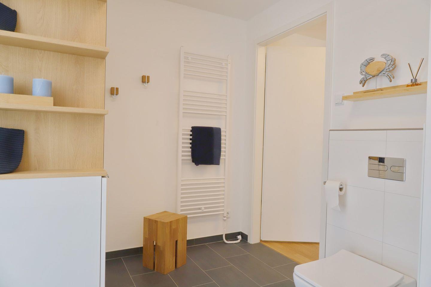Das Bad überzeugt mit seiner bodengleichen Dusche, in der auch ein Regenduschkopf nicht fehlt. WC, Handtuchheizung, ein moderner Waschtisch und Föhn gehören ebenfalls zur Ausstattung.