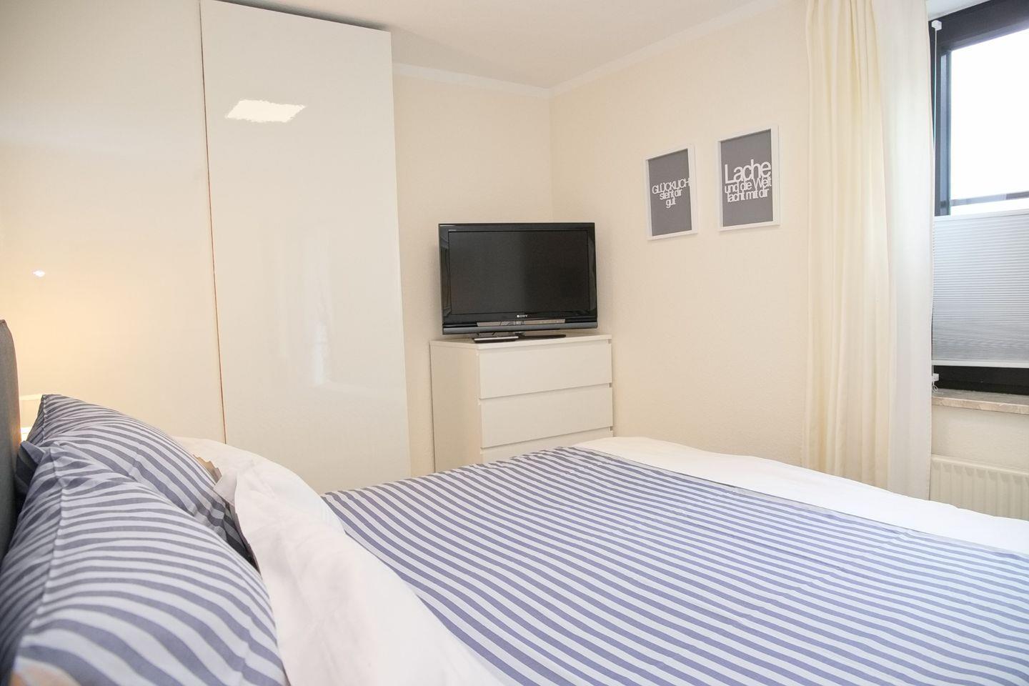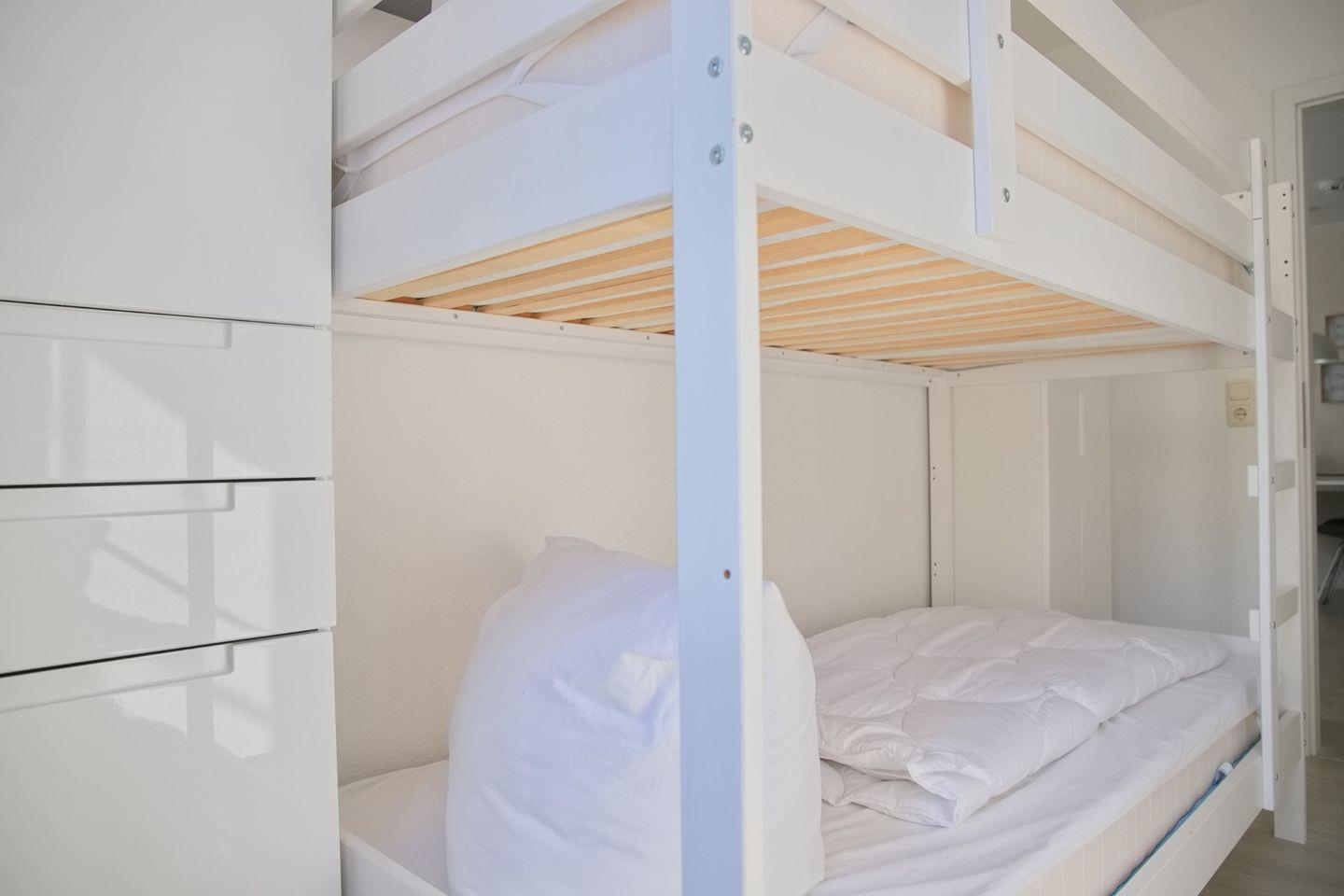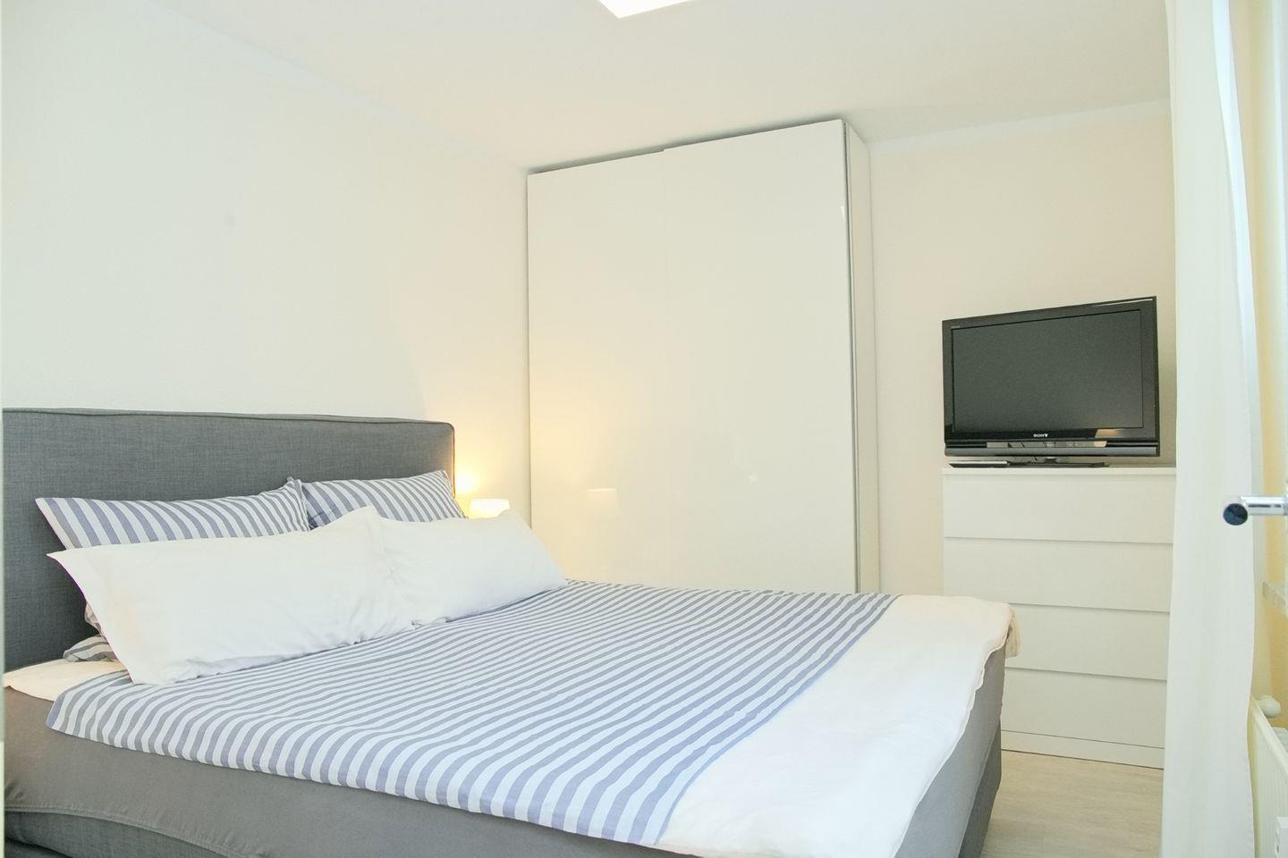 Das Appartement bietet Ihnen ein großzügiges Schlafzimmer mit Doppelboxspringbett (180x200cm), Kleiderschrank sowie Flatscreen TV und ein kleineres Schlafzimmer mit einem Etagenbett (90x200cm) ebenfalls mit einem Kleiderschrank. Zusätzlich bieten Ihnen beide Schlafräume Verdunkelungsmöglichkeiten.