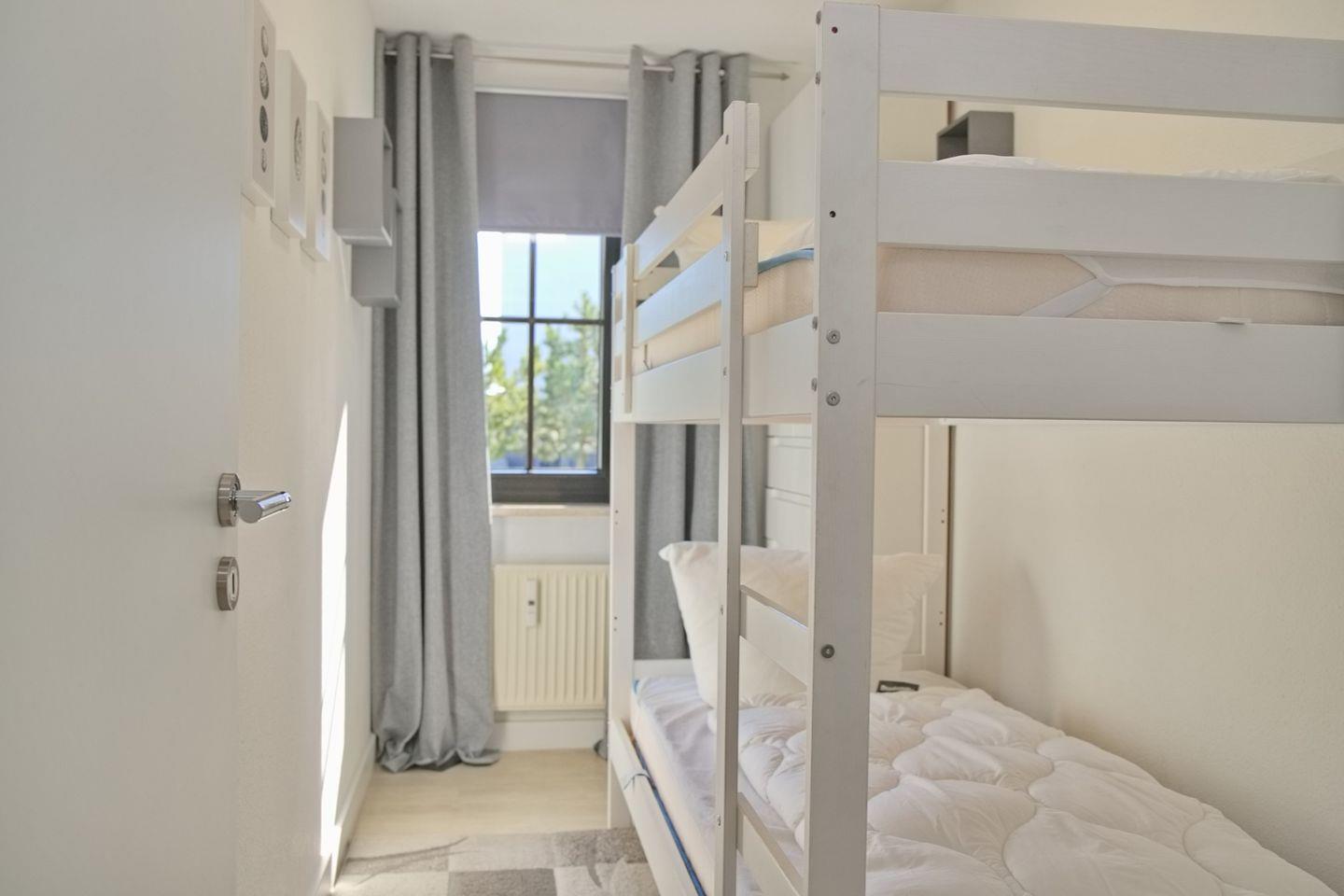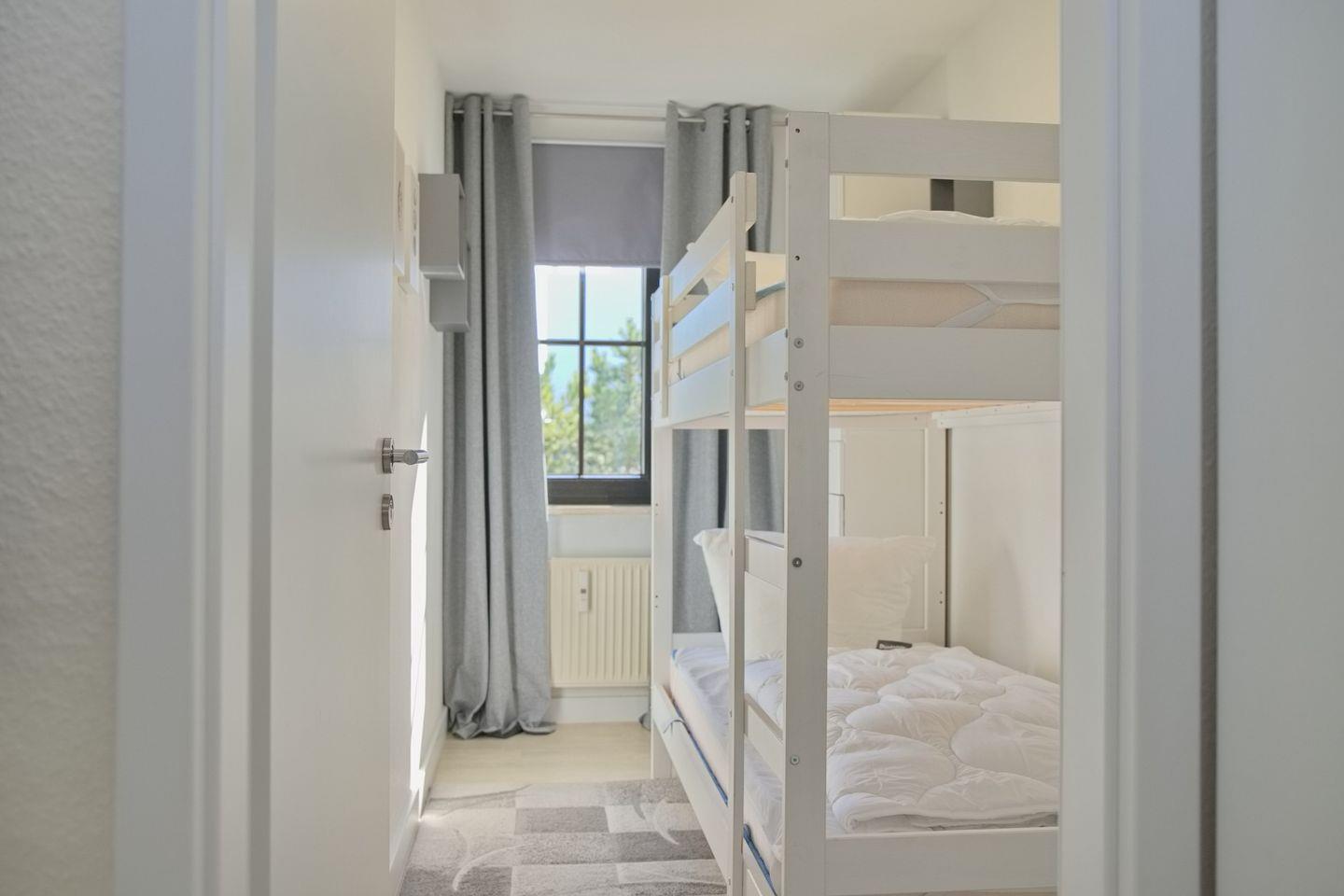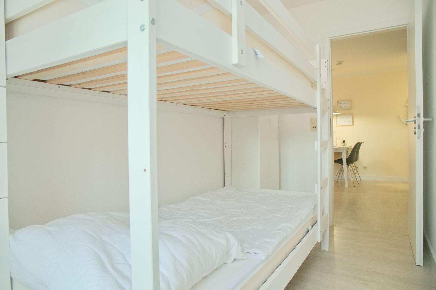 Das Appartement bietet Ihnen ein großzügiges Schlafzimmer mit Doppelboxspringbett (180x200cm), Kleiderschrank sowie Flatscreen TV und ein kleineres Schlafzimmer mit einem Etagenbett (90x200cm) ebenfalls mit einem Kleiderschrank. Zusätzlich bieten Ihnen beide Schlafräume Verdunkelungsmöglichkeiten.