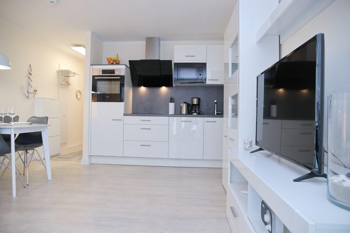 Küchenzeile ausgestattet mit Mikrowelle, Toaster, Cerankochfeld, Backofen, Geschirrspülmaschine, Kühlschrank mit Gefrierfach, Kaffeemaschine und Wasserkocher, ein Schlafraum mit Boxspringbett (180x200cm) und Flatscreen-TV, ein kleinerer Schlafraum mit Etagenbett (90x200cm), Bad mit Dusche, WC, beleuchtetem Spiegel.