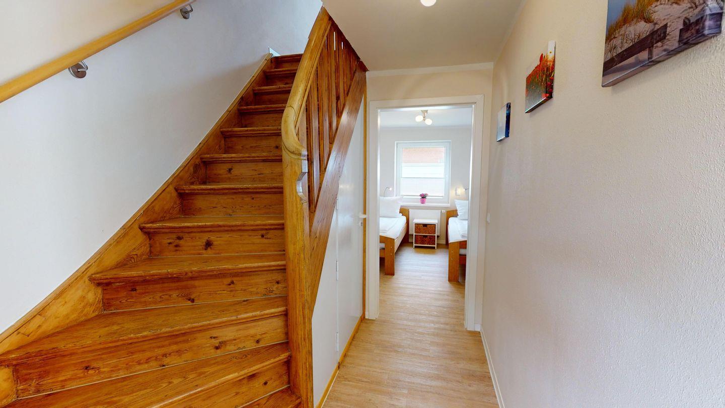 Im Erdgeschoss haben Sie ein Schlafzimmer mit zwei Einzelbetten, ein Duschbad, das großzügige Wohn- und Esszimmer mit offener, voll ausgestatteter Küchenzeile sowie Waschmaschine und Trockner. Über eine schöne Holztreppe gelangen Sie ins Obegeschoss mit dem zweiten Duschbad (mit Meerblick), einer Sitzgelegenheit sowie dem großzügigen zweiten Schlafzimmer mit Boxspringbett, großem Flat-TV und Einbaukleiderschrank.