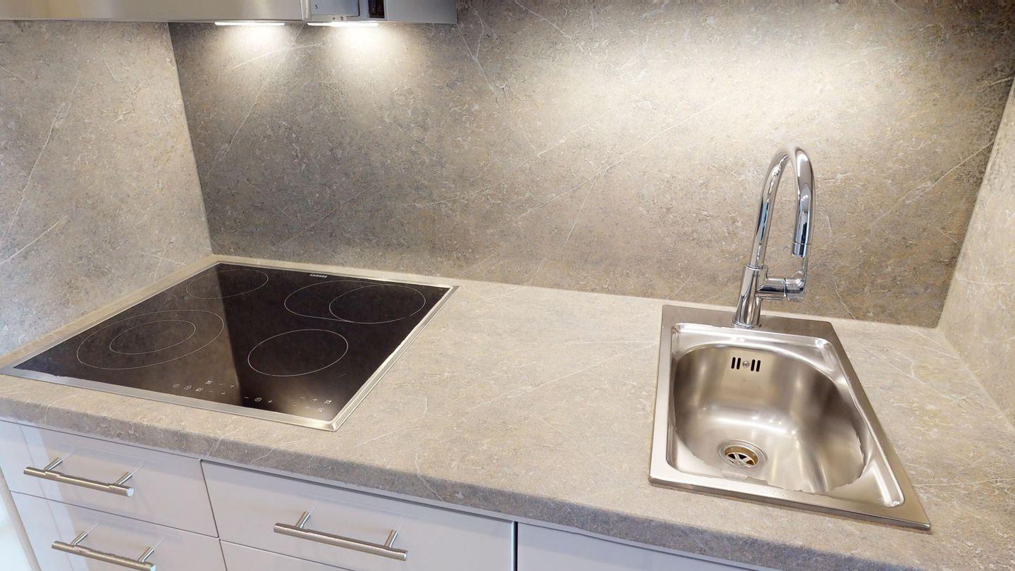 Sie verfügt über ein Schlafzimmer mit zwei Einzelbetten, ein Duschbad und eine Durchgangsküche.
