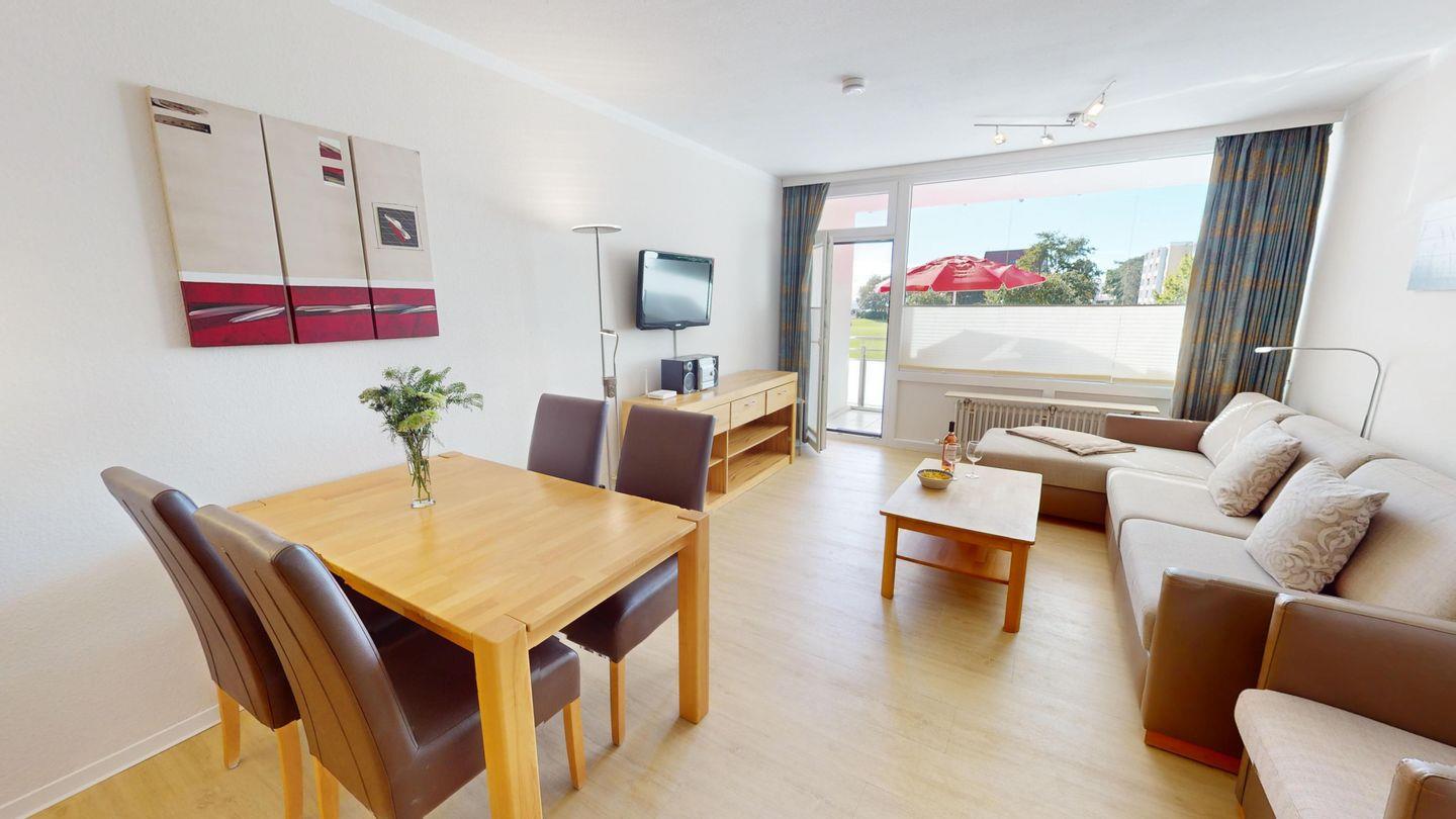 Im großen Wohn- und Esszimmer befindet sich ein gemütliches Schlafsofa mit zwei Schlafplätzen sowie der Zugang zum Balkon.