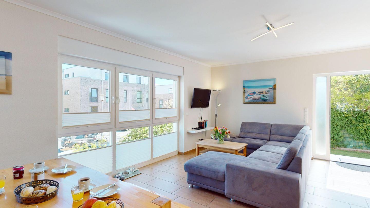 Die Wohnung befindet sich im Hochparterre und verfügt über drei separate Schlafzimmer (2x Doppelbett, 2 Einzelbetten), eine vollständig ausgestattete Einbauküche, ein helles Duschbad mit WC und einen gemütlichen Wohn- und Essbereich.