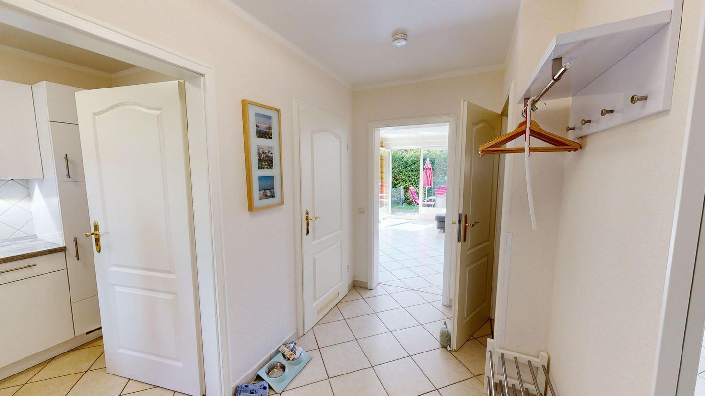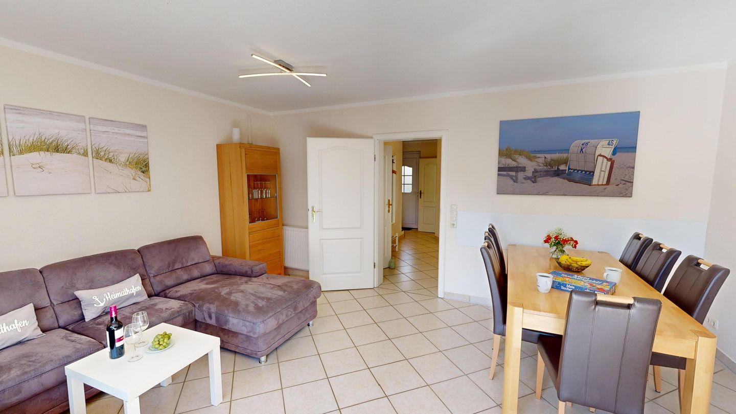 Das Haus verfügt über drei separate Schlafzimmer mit Doppelbetten, zwei Duschbäder, ein separates Gäste-WC sowie eine moderne, gut ausgestattete Küche. Im hellen Wohnzimmer mit bequemer Couchgarnitur können Sie entspannte Stunden verbringen für zusätzlichen Komfort sorgt der 65-Zoll Smart-TV inklusive MagentaTV, Netflix und Disney+ . Alle Räume sind mit Außenjalousien ausgestattet, und es gibt einen Waschtrockner.