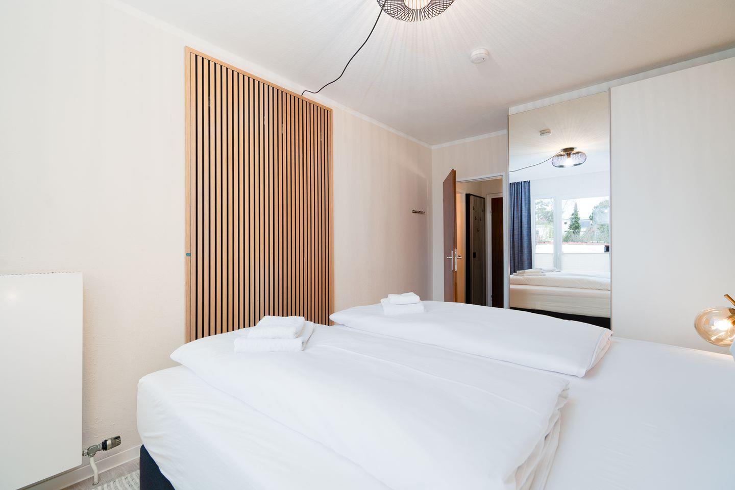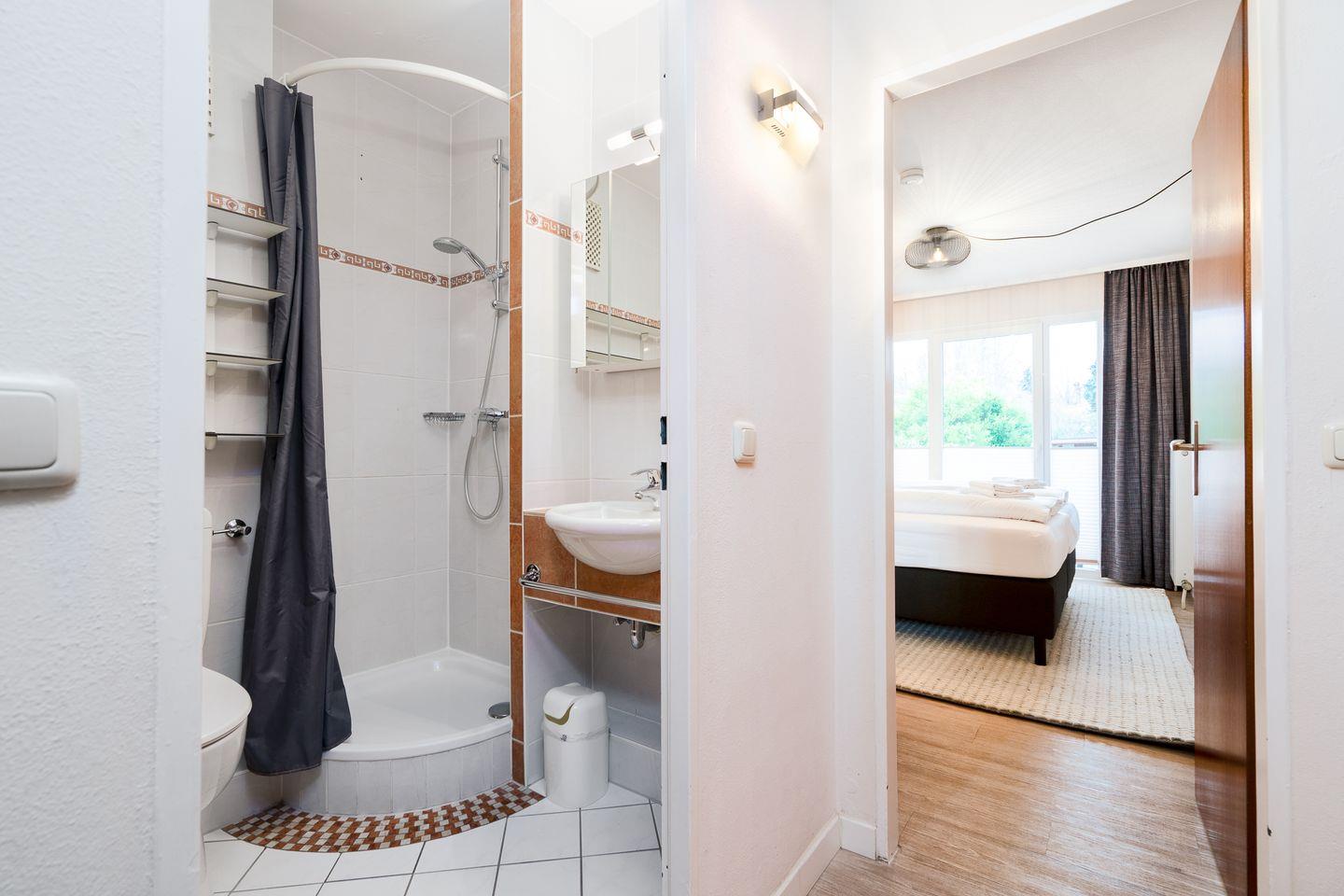 Die Wohnung verfügt über ein Schlafzimmer mit Doppelbett und bietet zusätzliche Schlafgelegenheit im Wohnbereich für 2 Personen auf einer komfortablen Schlafcouch. Beide Räume lassen sich abdunkeln. Auf Wunsch stellen wir gerne kostenlos ein Kinderbett und einen Hochstuhl zur Verfügung. Das Bad ist mit einer Dusche ausgestattet.