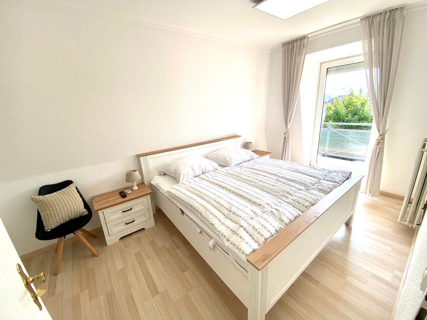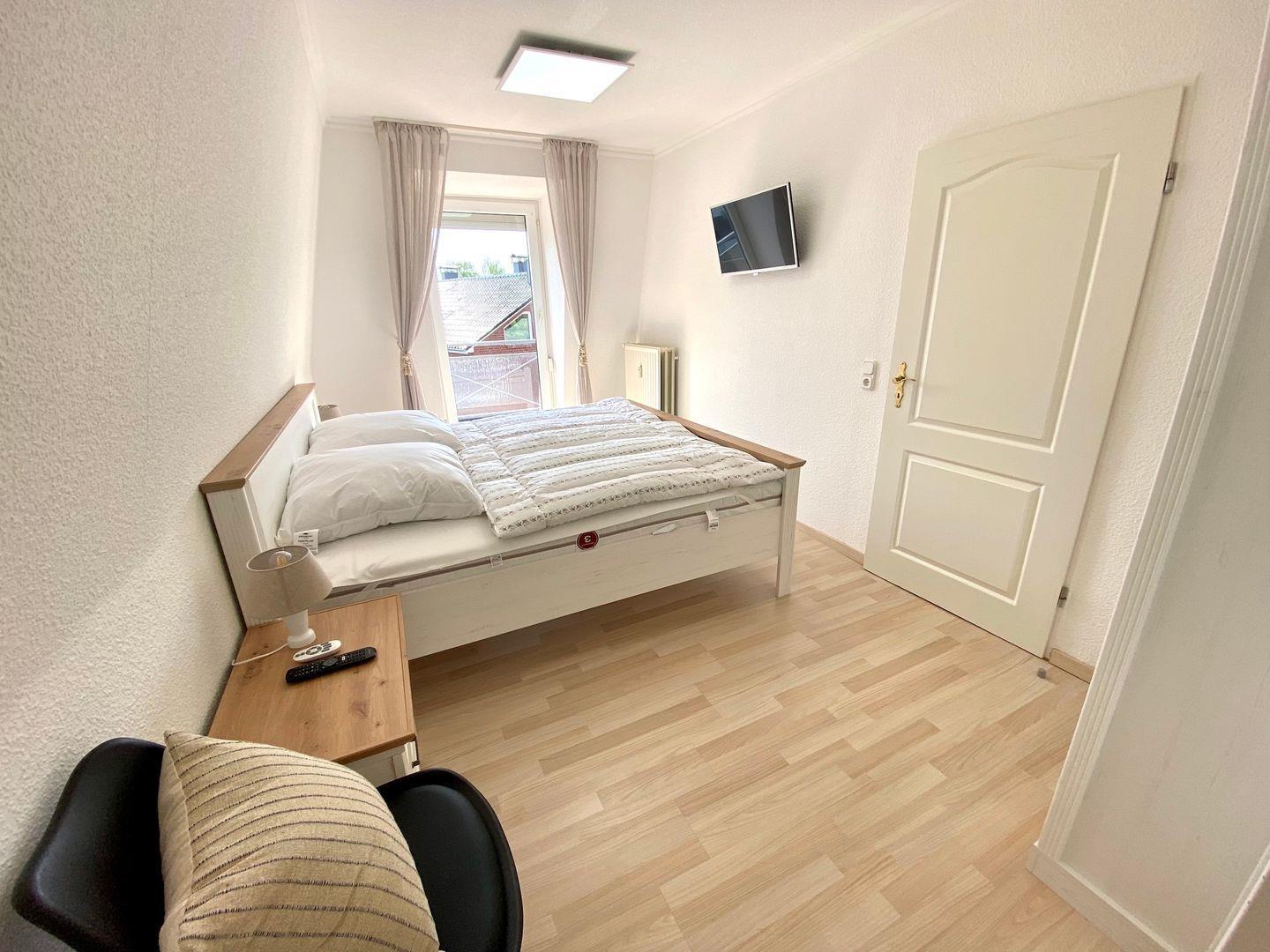 Das Schlafzimmer verfügt über ein Doppelbett (2x 90cm x 200cm), einen Kleiderschrank und einen Flachbildfernseher an der Wand. Von hier gelangen Sie auch in das helle frisch in 2024 renovierte Duschbad (mit Fenster).