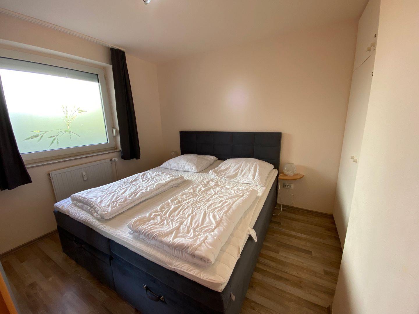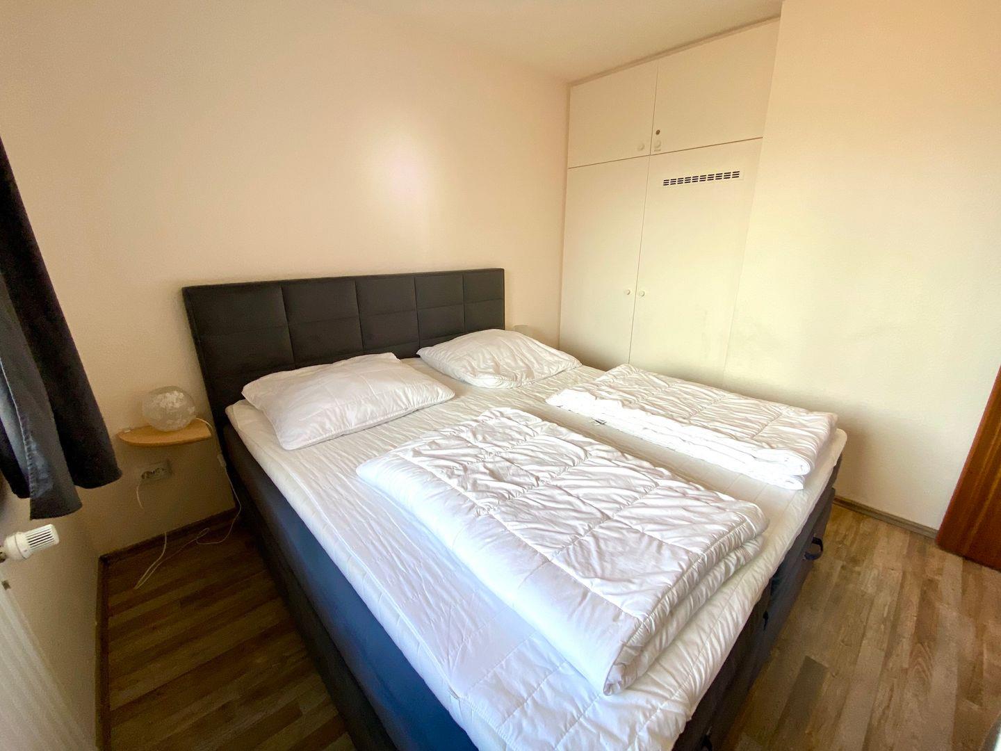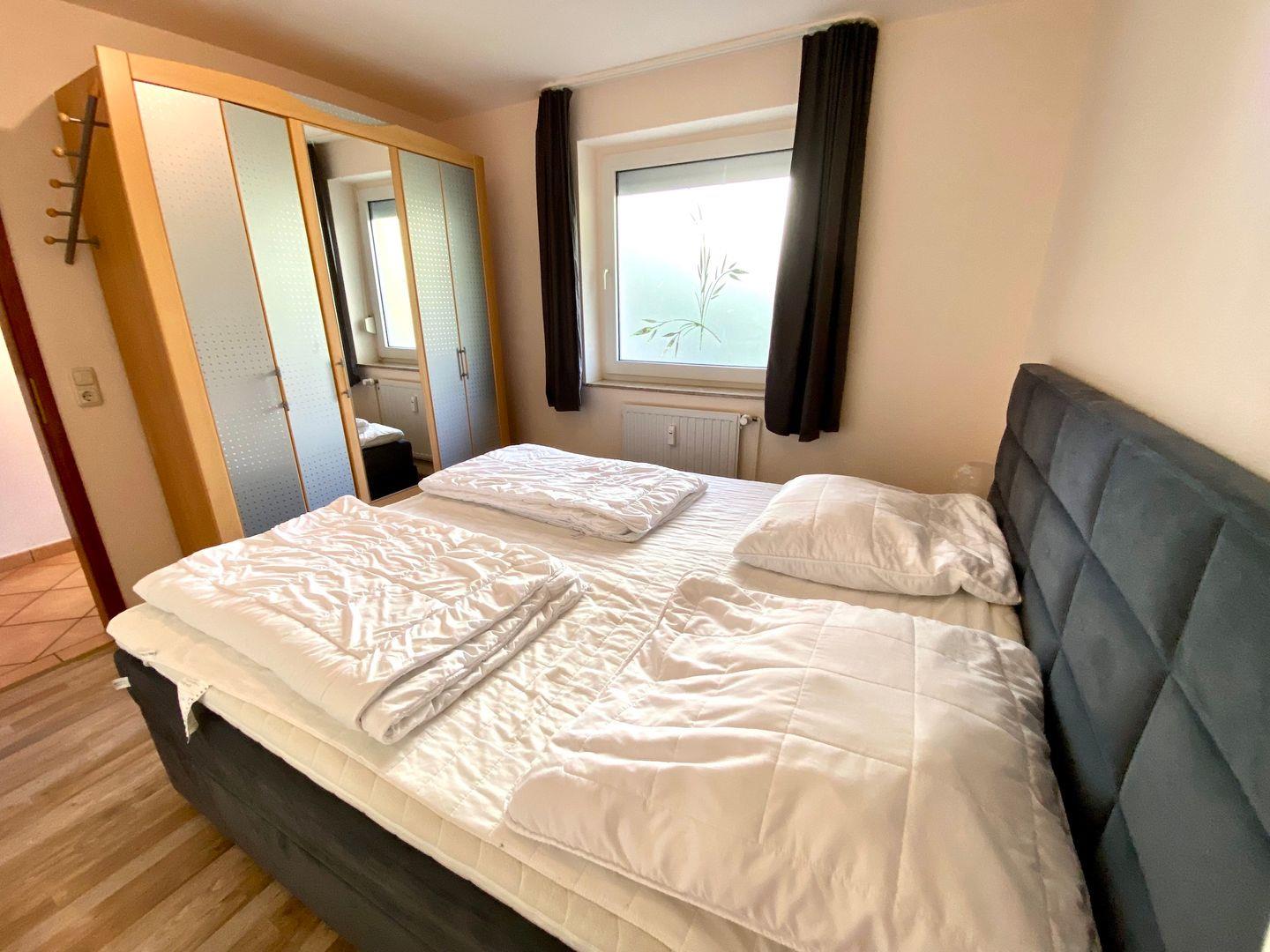 Im Schlafzimmer erwartet Sie ein komfortables Doppelbett (180cm x 200cm) und genug Stauraum für Ihre Urlaubsgarderobe.