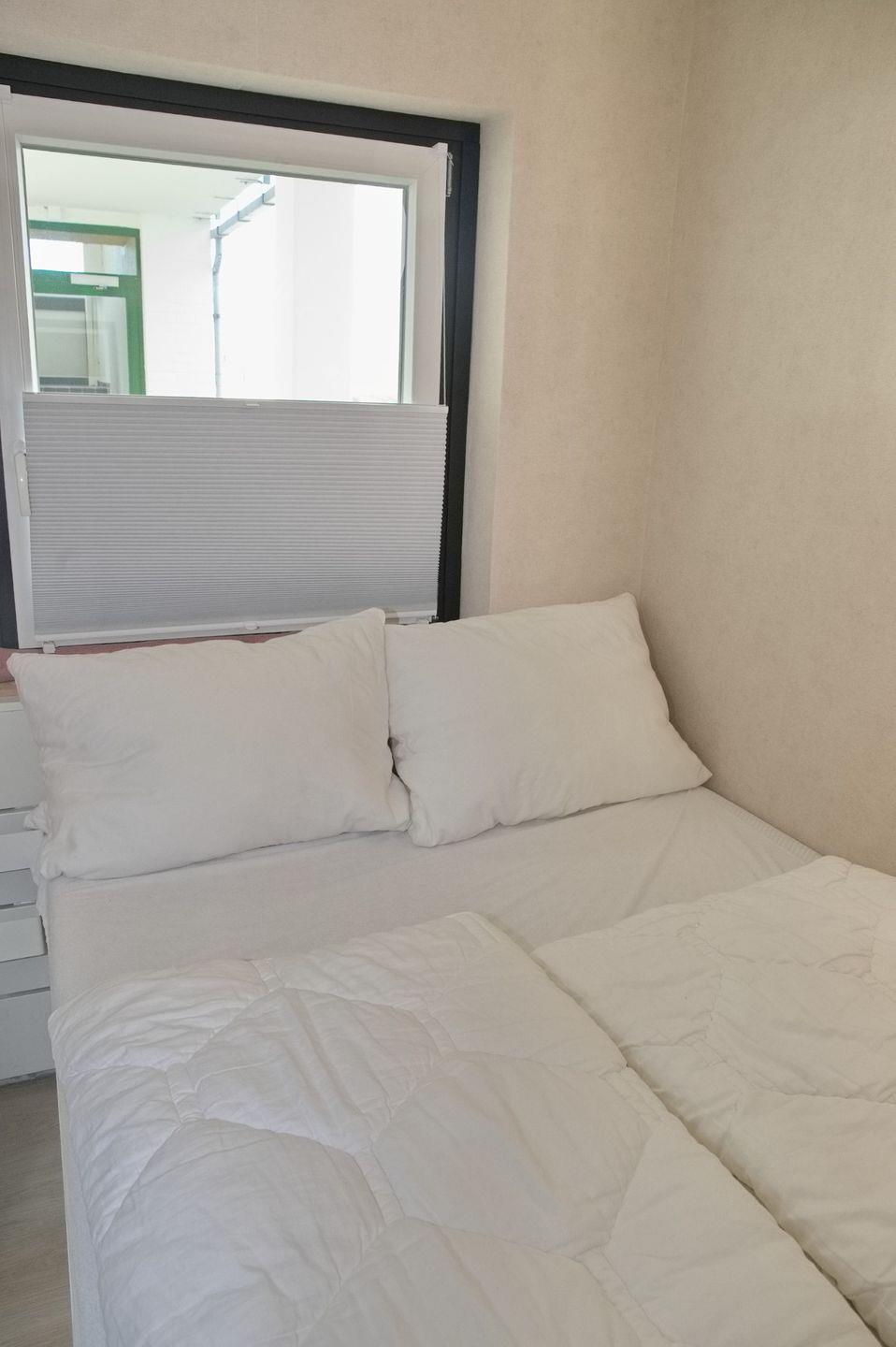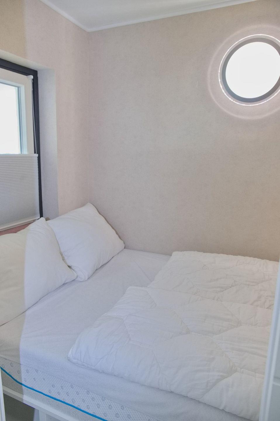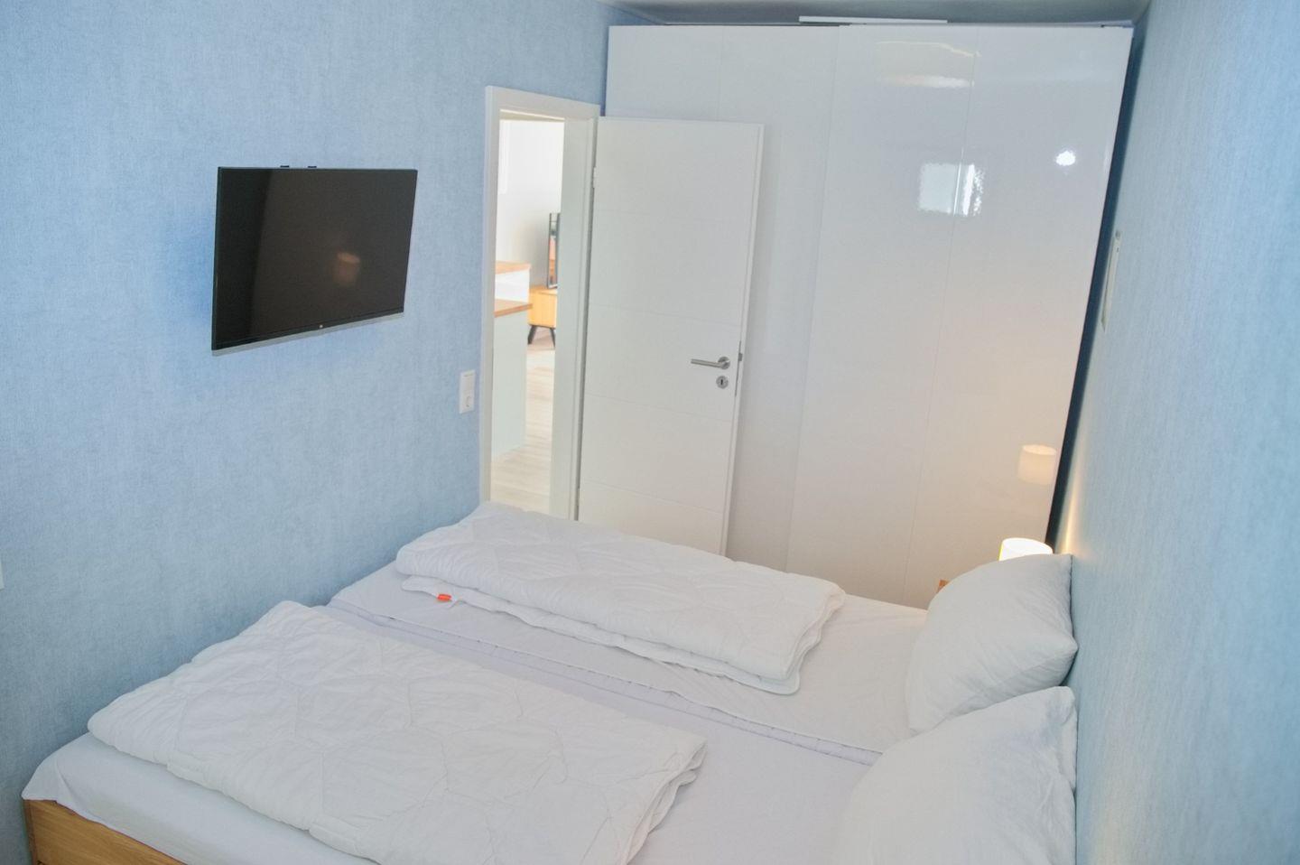 Die beiden Schlafzimmer bieten höchsten Komfort. Das erste Schlafzimmer verfügt über ein großes Doppelbett (180 x 200 cm), einen Flachbild-TV, einen Kleiderschrank und Verdunklungsplissees für erholsame Nächte. Das zweite Schlafzimmer ist ebenfalls mit einem Doppelbett (140 x 200 cm), einem Flachbild-TV und Verdunklungsplissees ausgestattet, jedoch etwas enger bemessen.