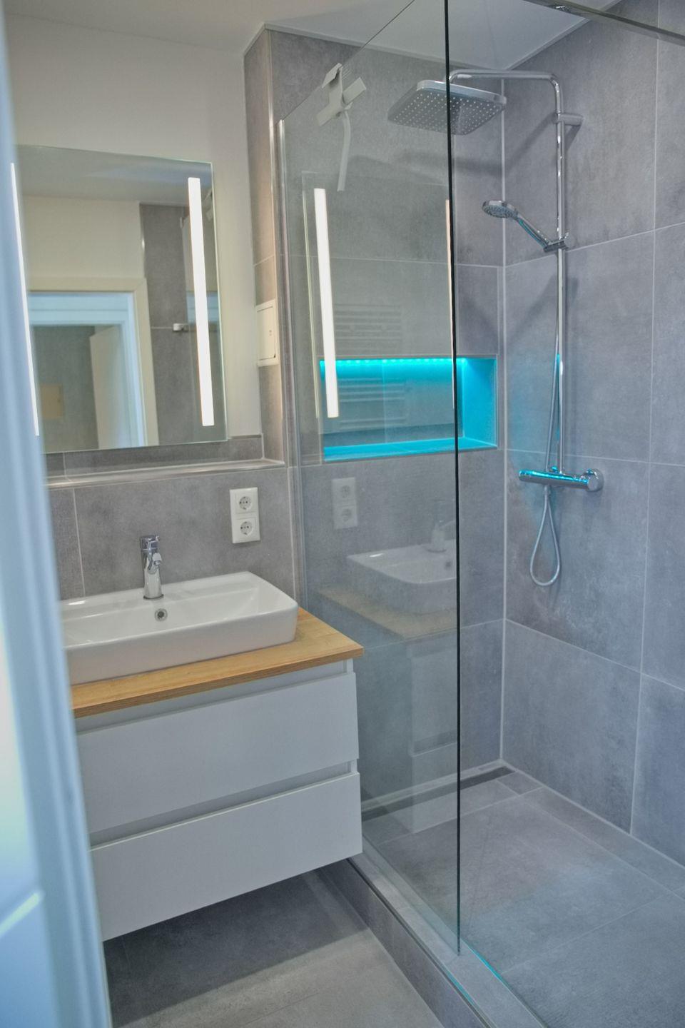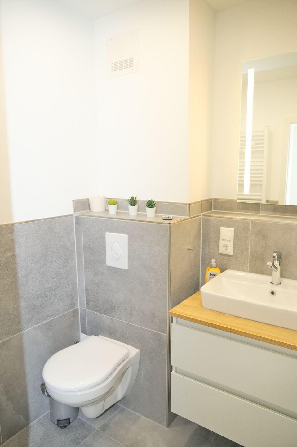 Das Badezimmer ist modern und verfügt über eine Dusche mit LED-Beleuchtung, ein WC und einen Waschtisch.