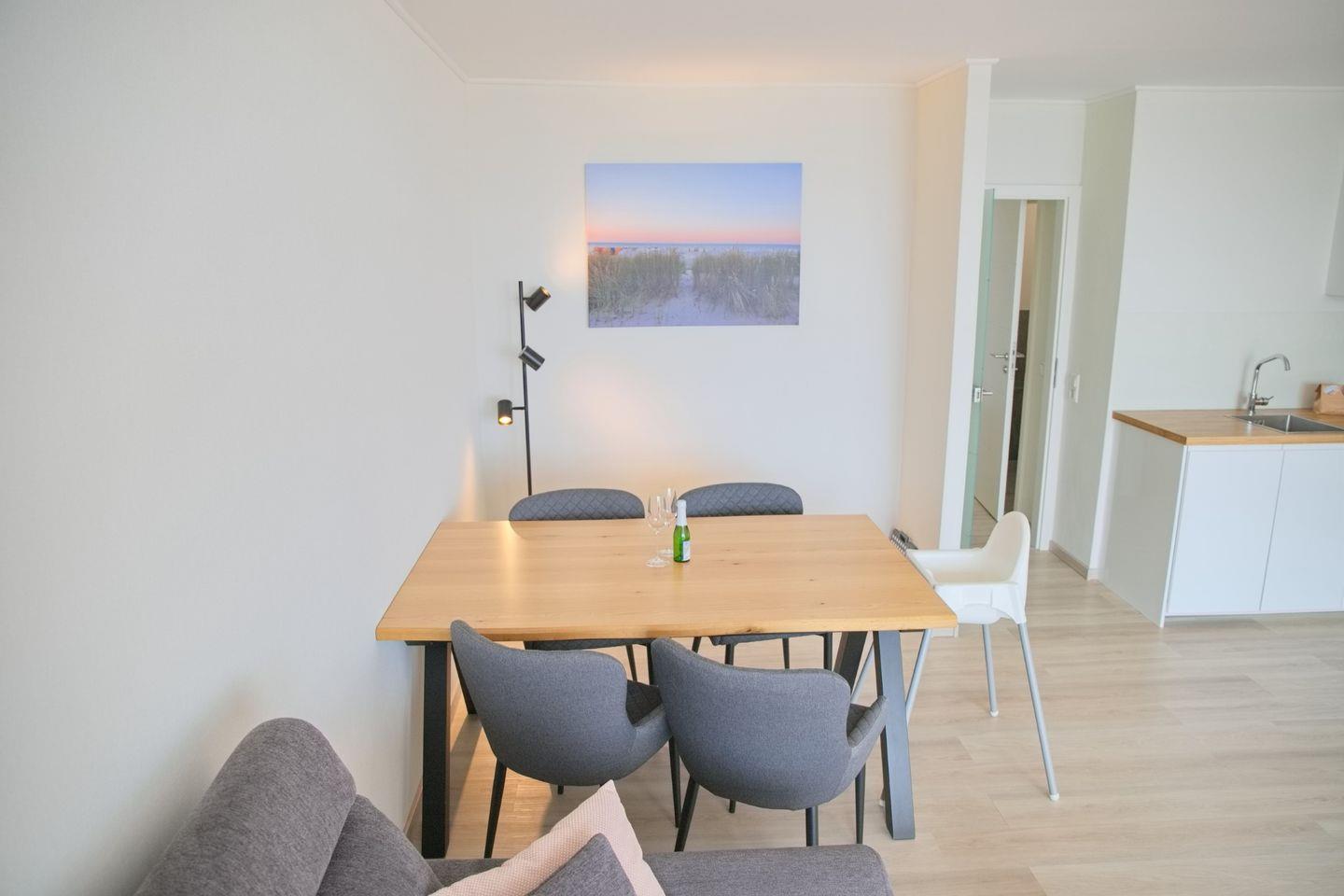 Der Essbereich bietet Platz für 5 Personen und lädt zu gemütlichen Mahlzeiten ein. Die offene Küche zum Wohnzimmer ist mit einem Induktionskochfeld, einem Backofen, einer Geschirrspülmaschine, einem Kühlschrank mit 3-Sterne-Gefrierfach, einer Kaffeemaschine, einem Wasserkocher und einem Toaster ausgestattet. Hier können Sie nach Herzenslust kochen und sich kulinarisch verwöhnen.