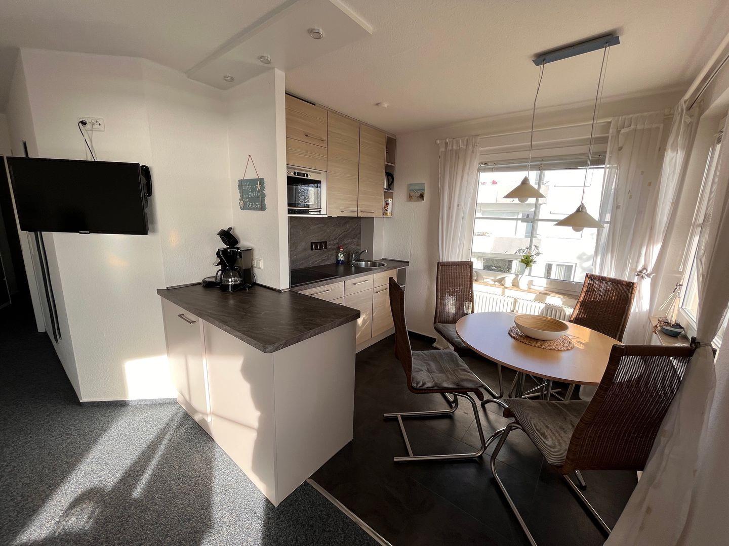 Die offen gestaltete Küche bietet alles nötige für Ihren Aufenthalt ist, auch eine Spülmaschine ist vorhanden.