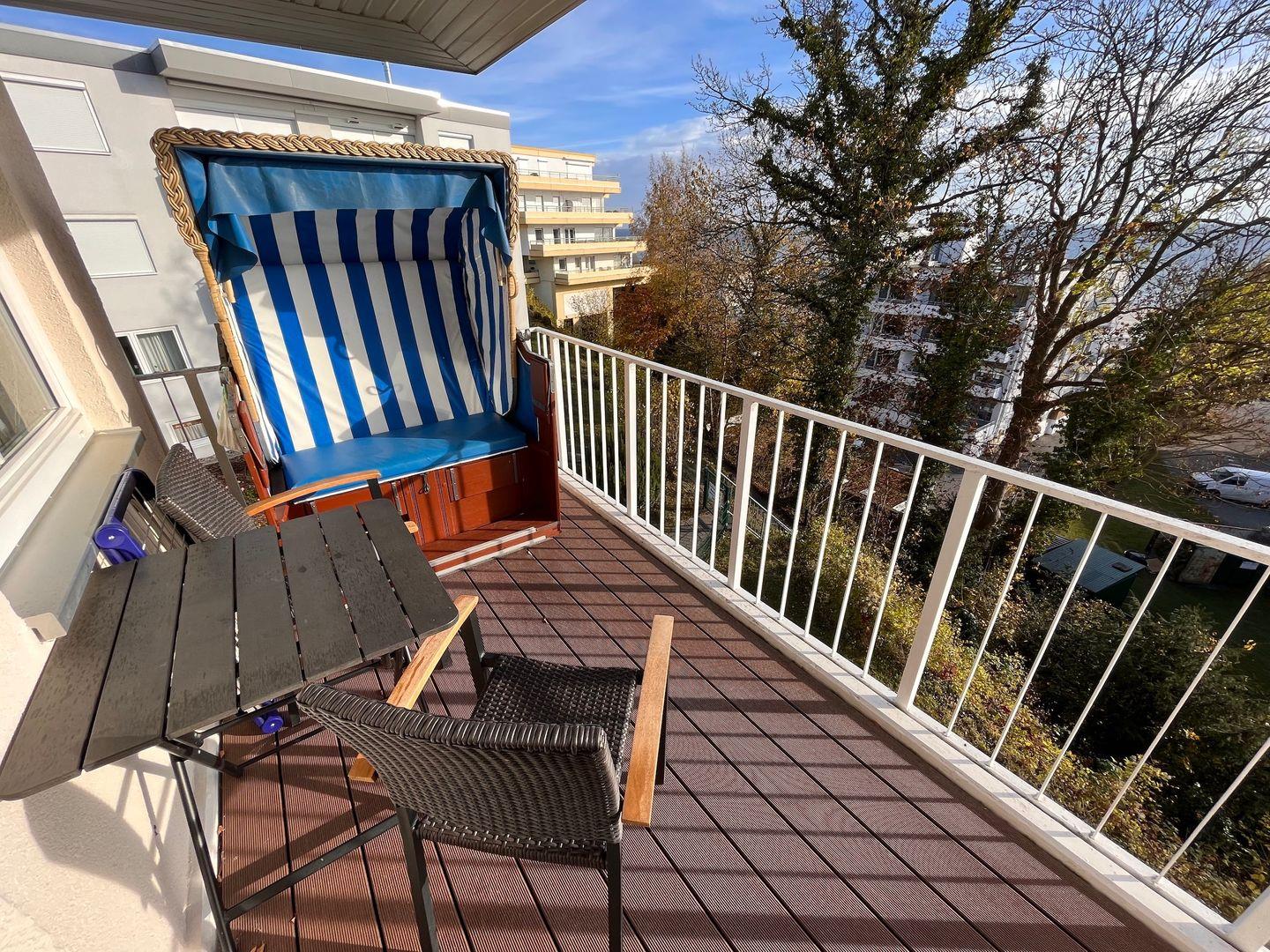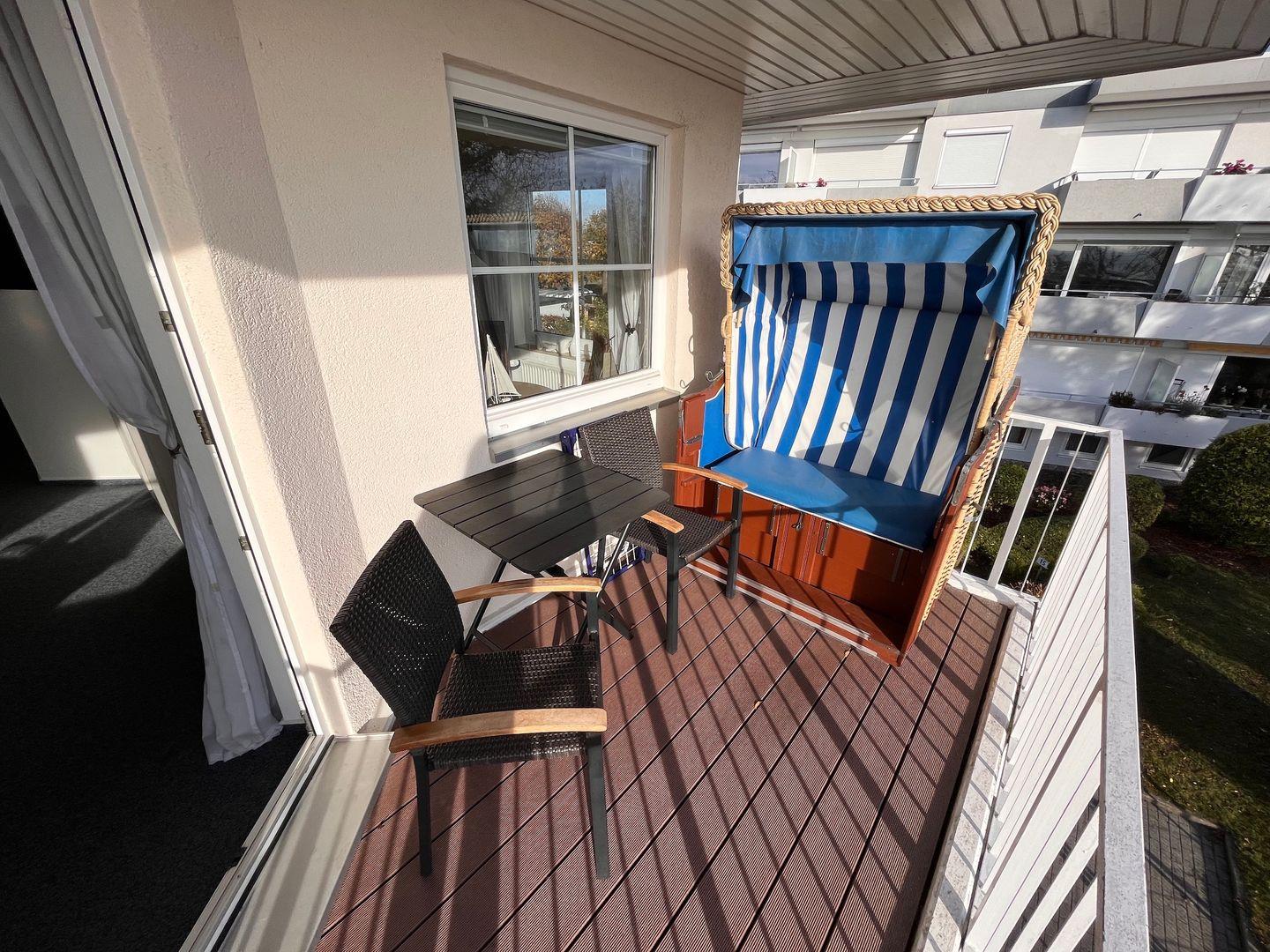 Der Balkon ist möbliert, überdacht und verfügt über einen Strandkorb.