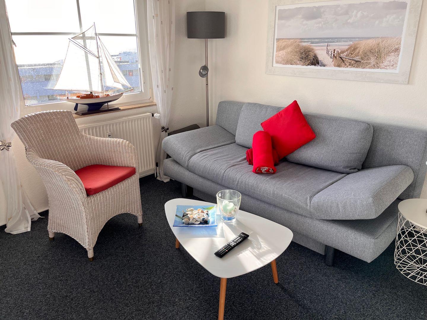 Der gemütliche Wohn- und Essbereich bildet das Herzstück der Ferienwohnung. Hier lässt sich´s abends einen gemütlichen Fernsehabend auf dem Sofa verbringen und wenn Sie zu dritt oder viert anreisen, lässt sich das Sofa ganz einfach zum Bett umfunktionieren.
