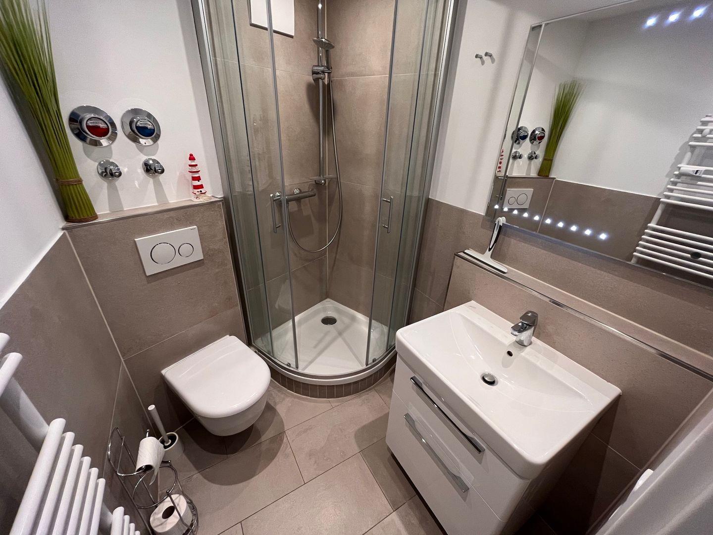 Das moderne Badezimmer ist mit einer Dusche, Waschbecken, WC und Föhn ausgestattet.