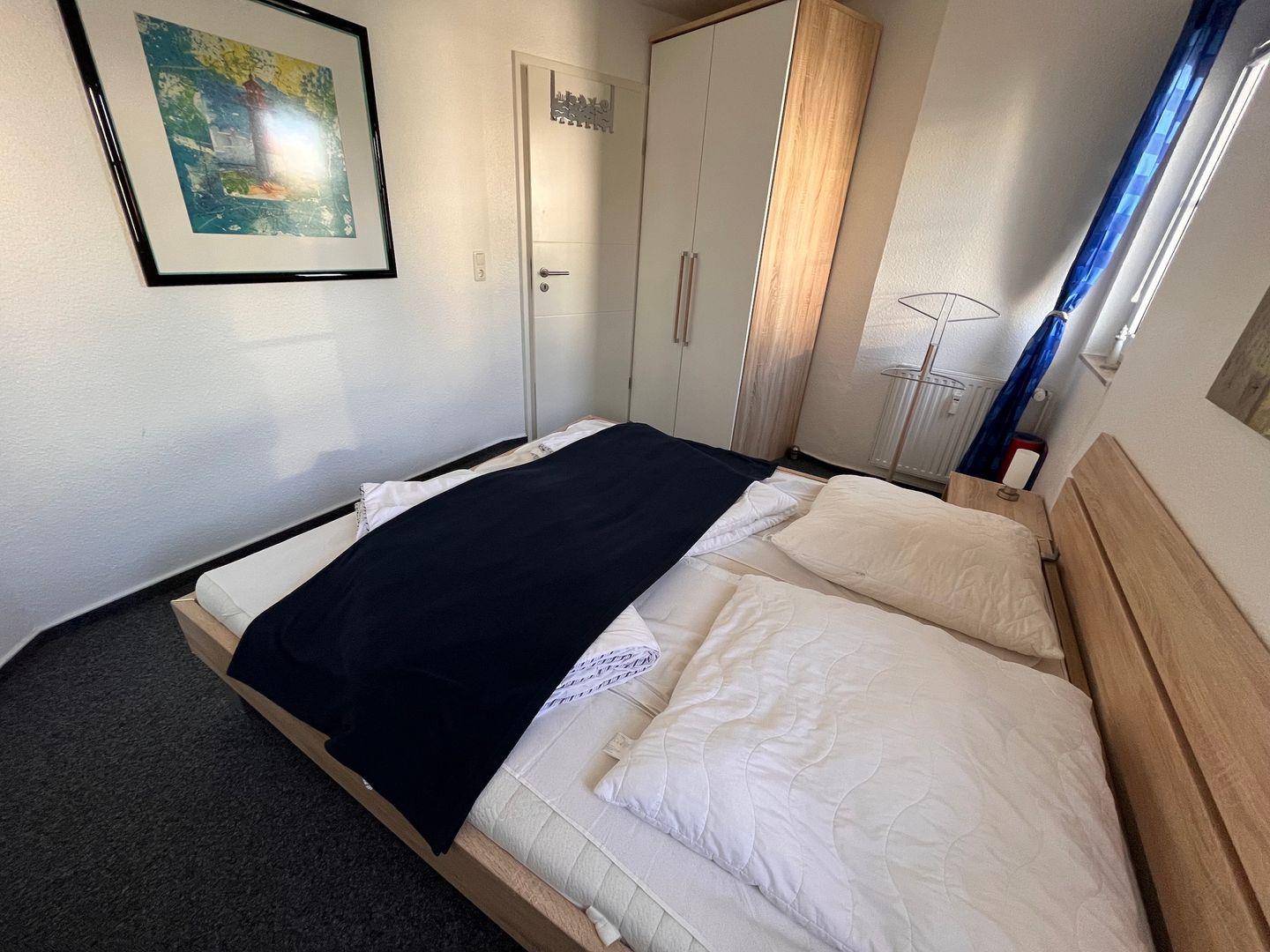 Vom Flur aus gelangen Sie in das gemütliche Schlafzimmer mit Doppelbett (2x 90x200 cm) und einem Kleiderschrank für Ihre Urlaubsgarderobe.