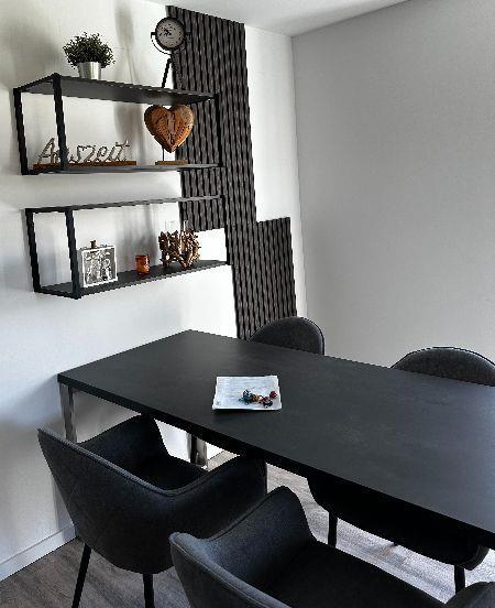 Das moderne Badezimmer ist mit einer begehbaren Dusche, einem WC und einem stilvollen Waschtisch ausgestattet – ideal für einen frischen Start in den Tag. Im Eingangsbereich finden Sie eine praktische Garderobe sowie einen Schuhschrank und einen Staubsauger, sodass auch längere Aufenthalte angenehm organisiert bleiben.