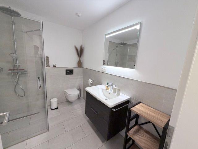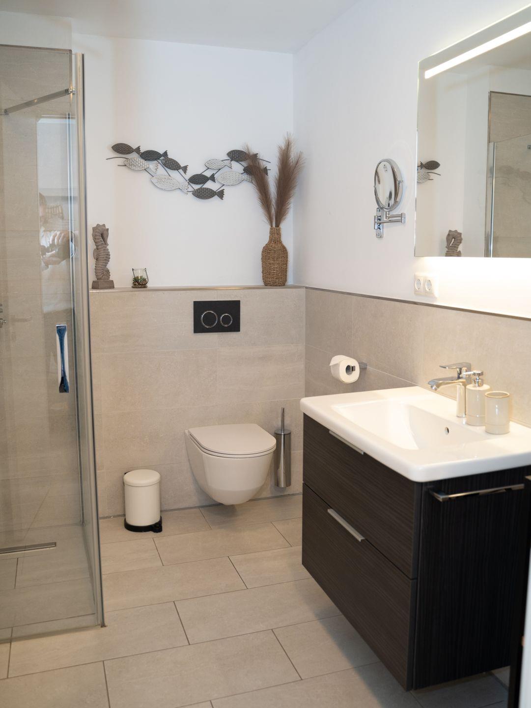 Das moderne Badezimmer bietet Ihnen eine ebenerdige Dusche, ein WC sowie einen stilvollen Waschtisch – hier beginnt jeder Tag mit Komfort.