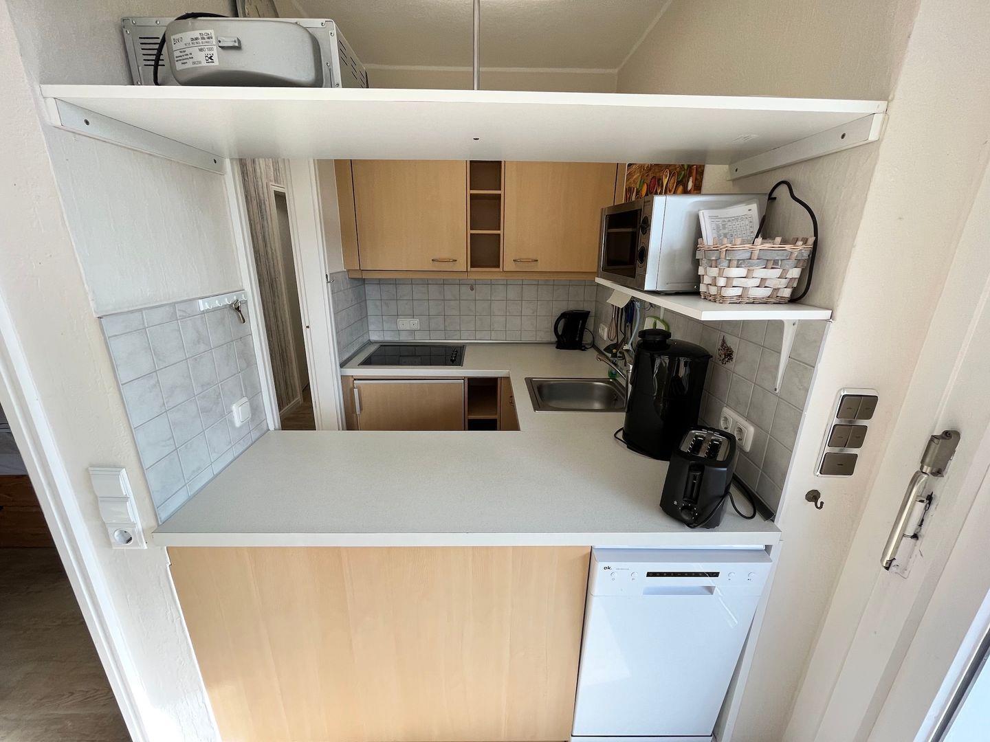Die halb offene Küche beinhaltet einen Kühlschrank mit Gefrierfach, Kaffeemaschine, Wasserkocher, kombinierte Mikrowelle mit Heißluftbackofen und Spülmaschine.