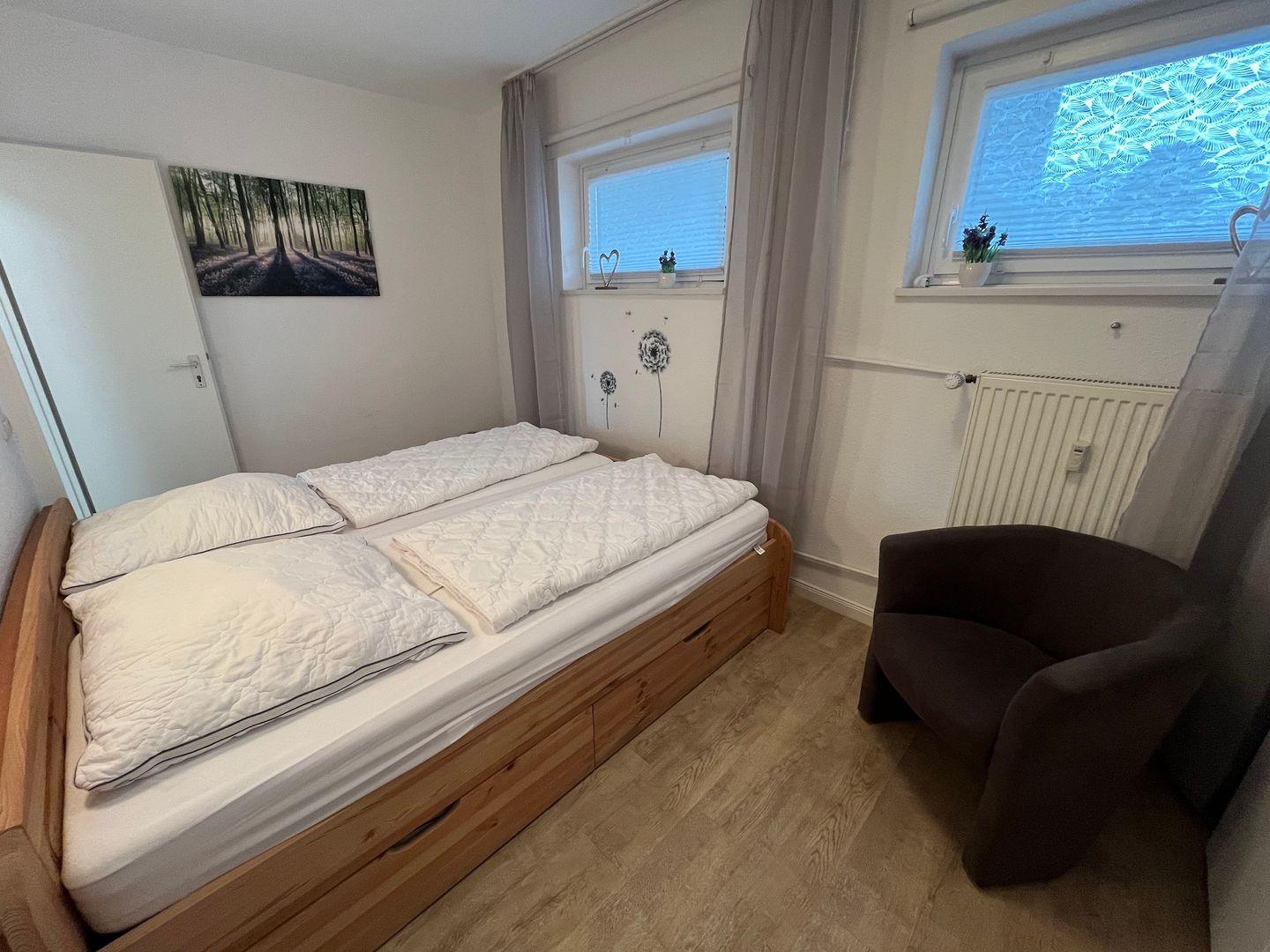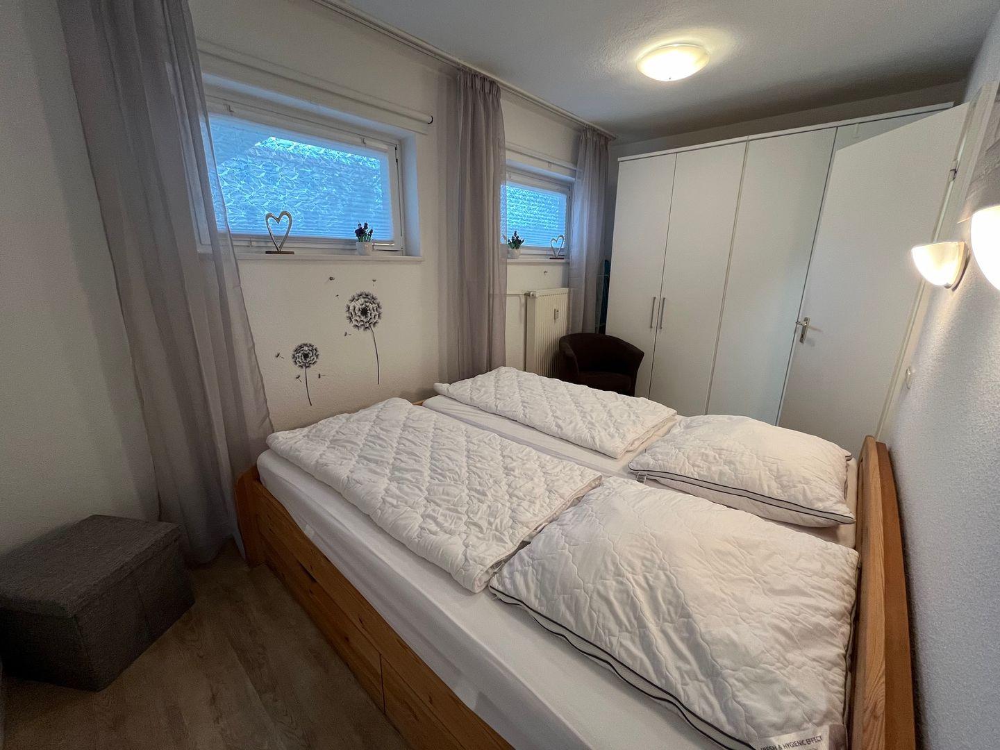 Das Schlafzimmer ist mit einem Doppelbett (2x 90cm x 200 cm) und einem Kleiderschrank ausgestattet.