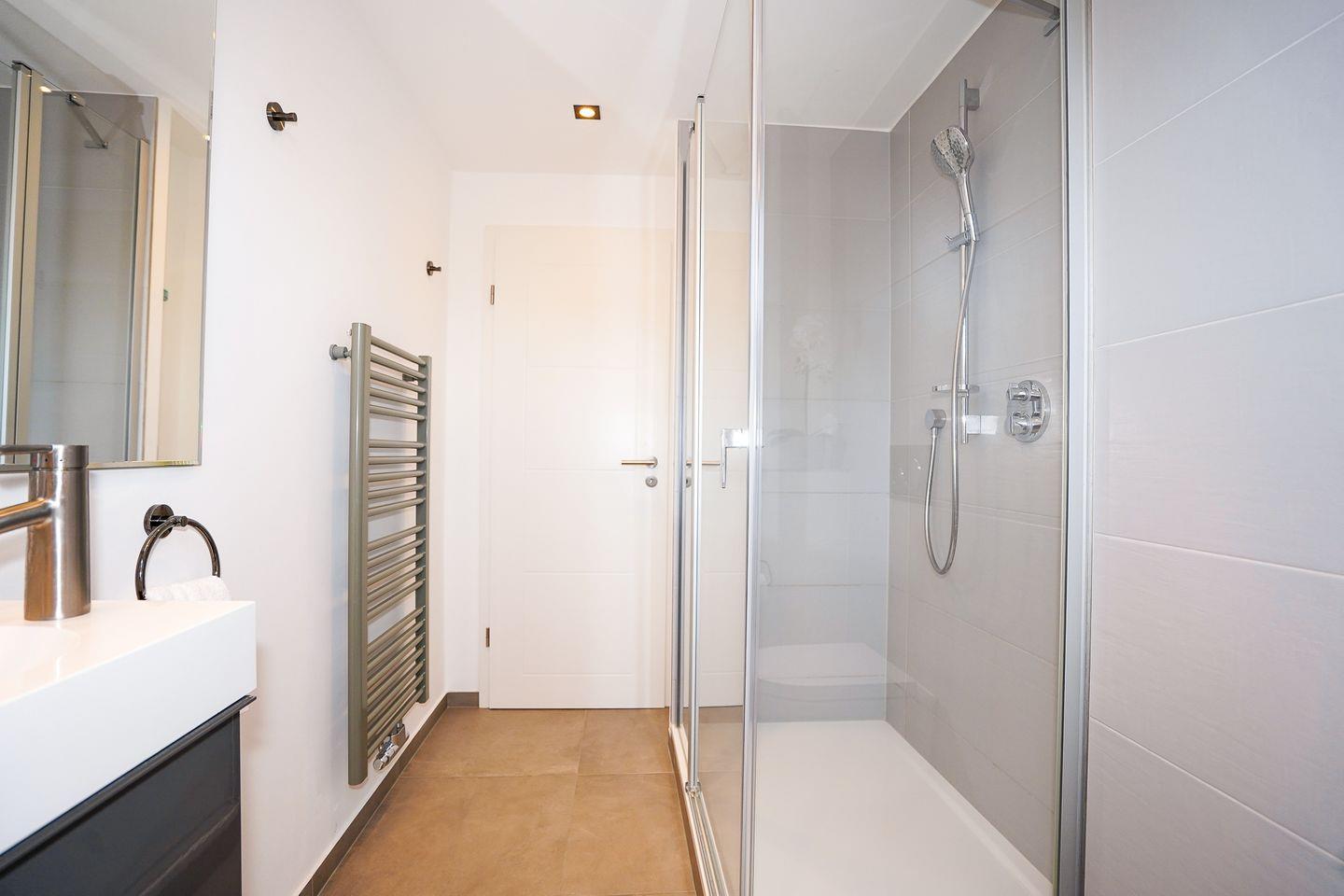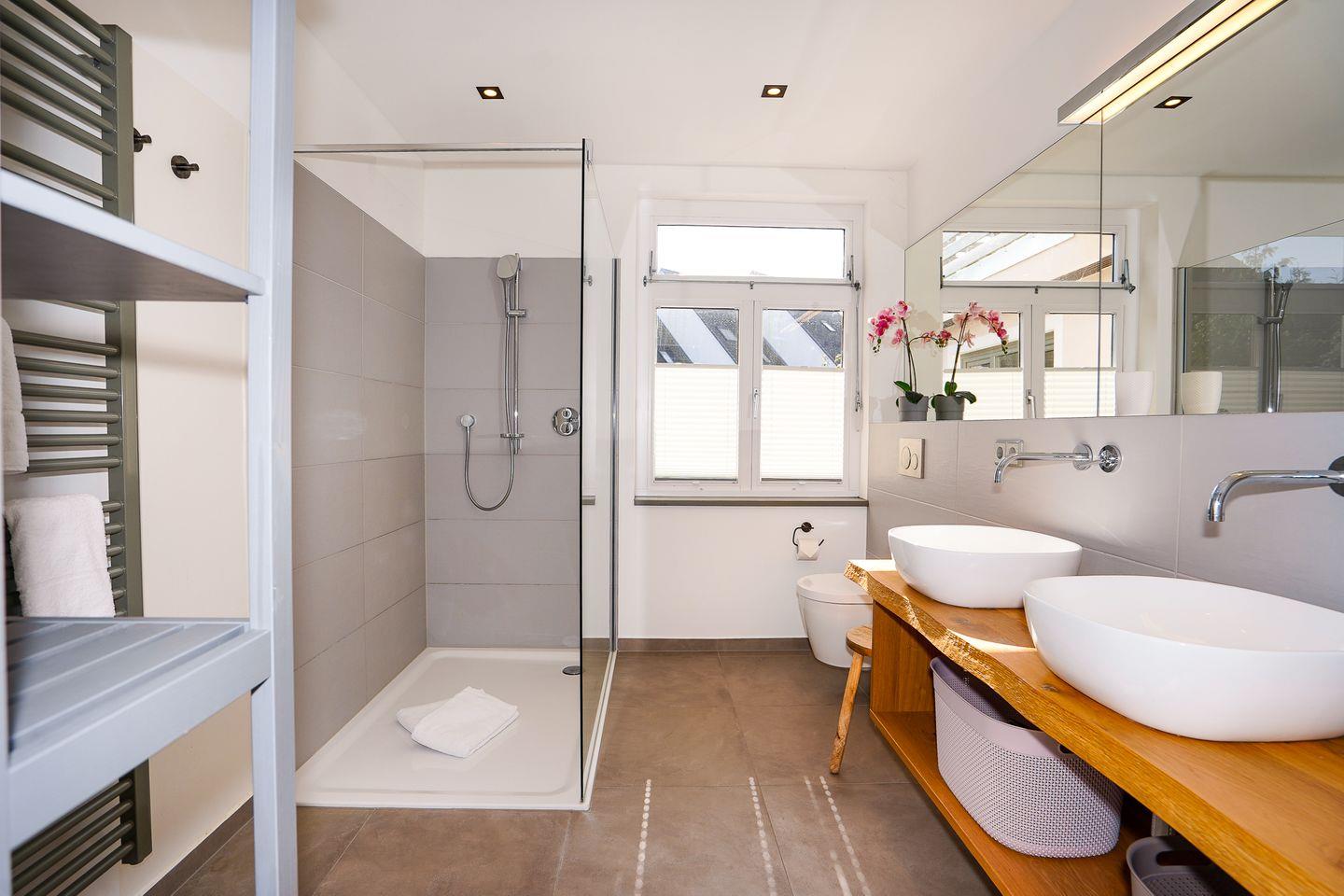 Zwei vollwertige Schlafzimmer (eins mit Doppelbett, eins im Dachgeschoss mit Doppelbett + Einzelbett) und ein dazugehöriges Vollbad schaffen Privatsphäre, dazu gibt es ein weiteres Duschbad mit WC.