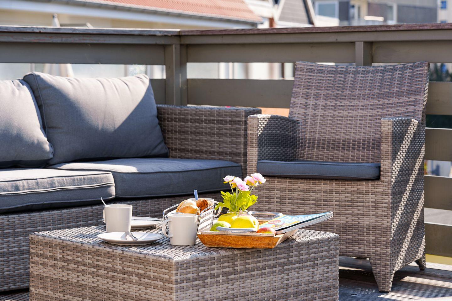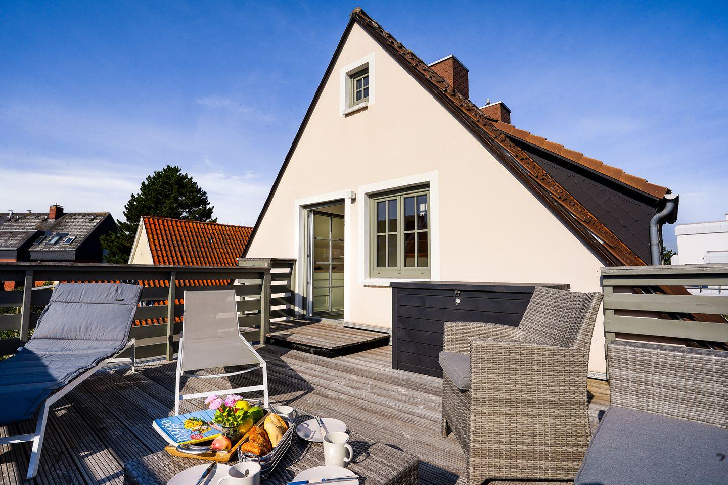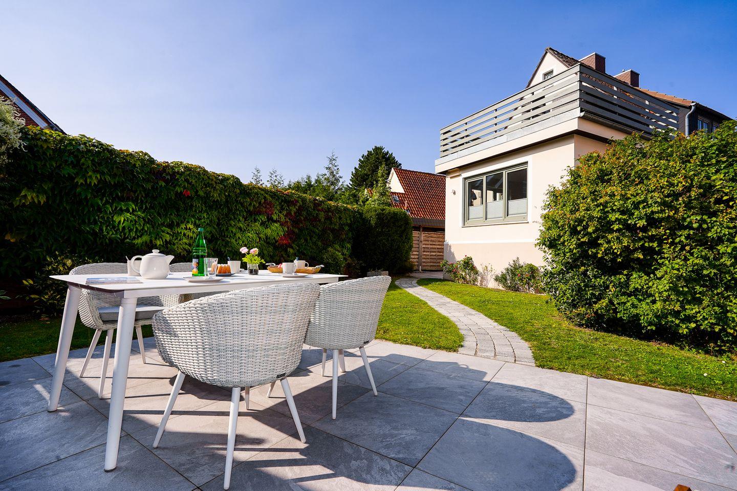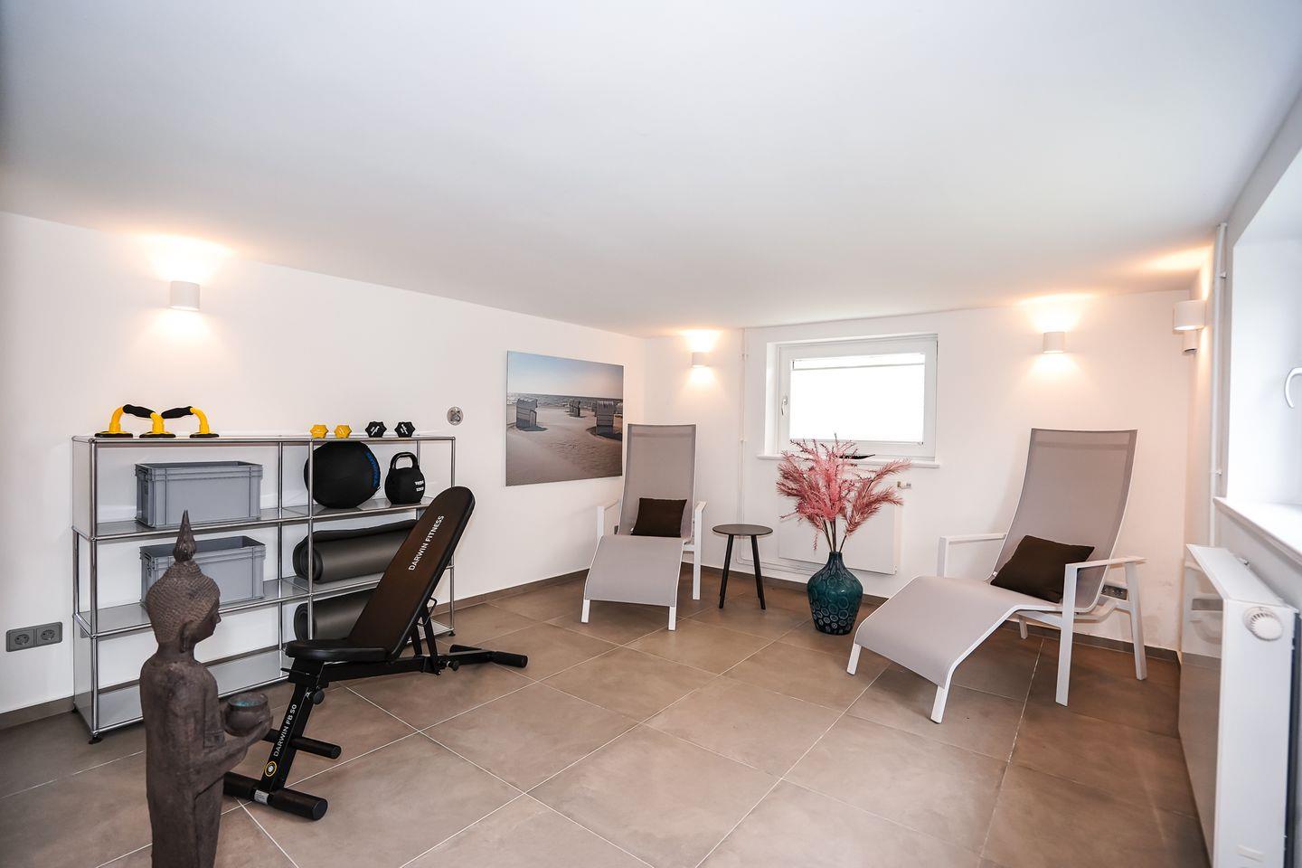 Genießen Sie Ihren eigenen Sauna- & Fitnessbereich im 45 m² großen Souterrain. Entspannung finden Sie auf der sonnengefluteten Dachterrasse oder im Strandkorb im Garten.