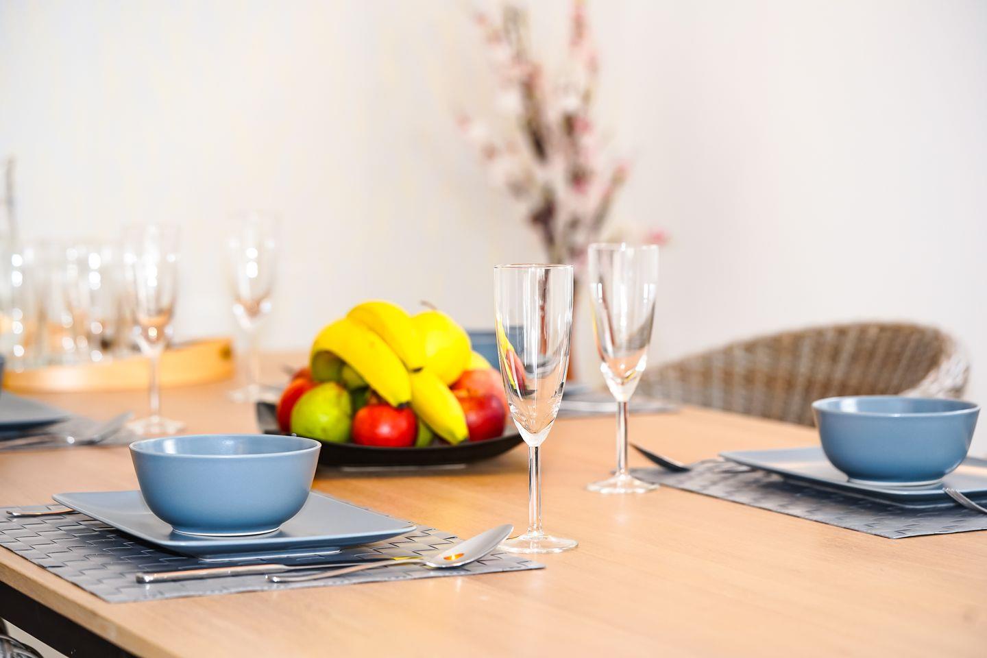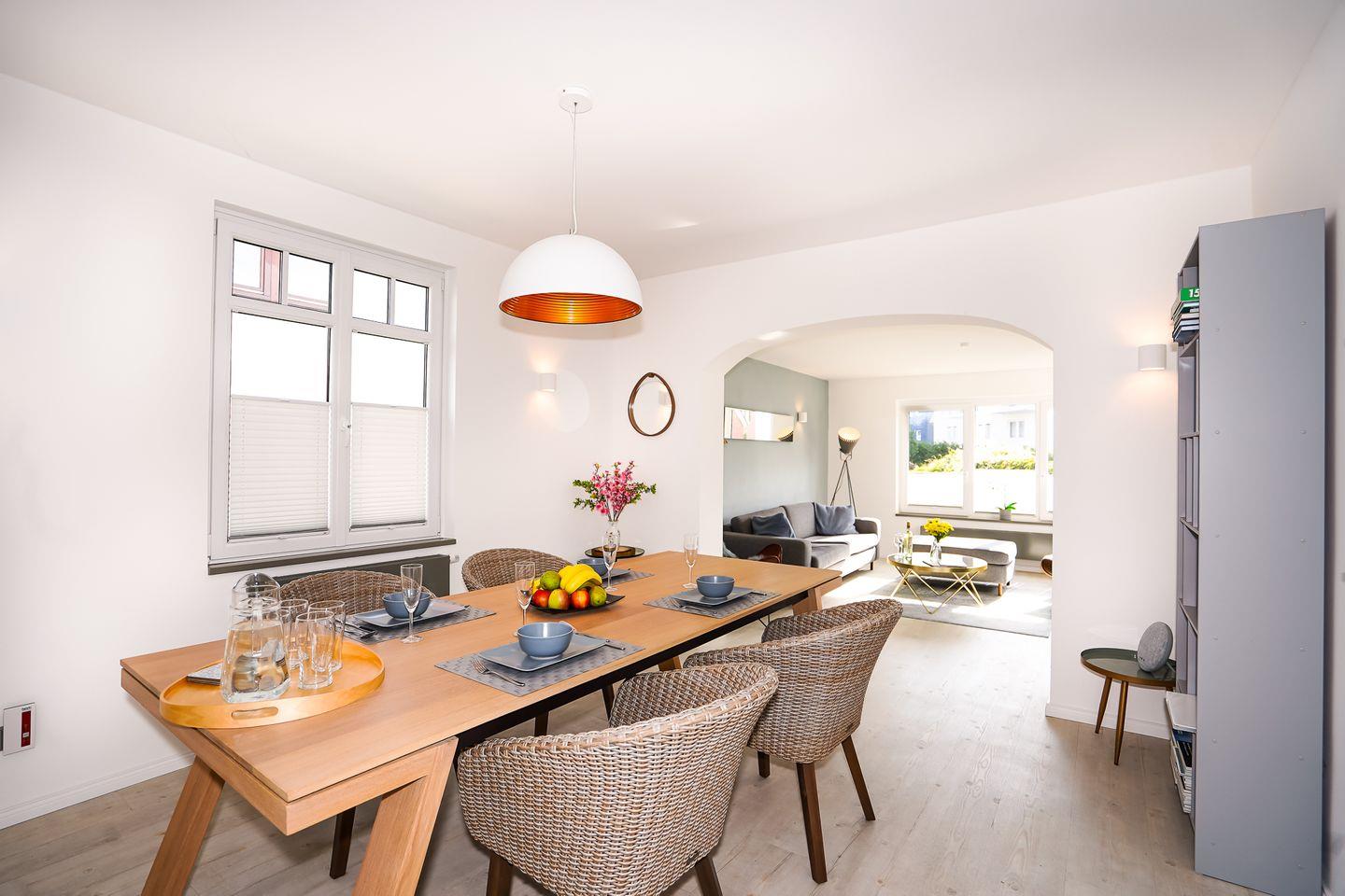Für gemeinsame Mahlzeiten oder Spielerunden ist ausreichend Platz am großen Esstisch mit Übergang zum Wohnzimmer. Die Villa verfügt über 5 vollwertige Schlafplätze und ein Babybett.