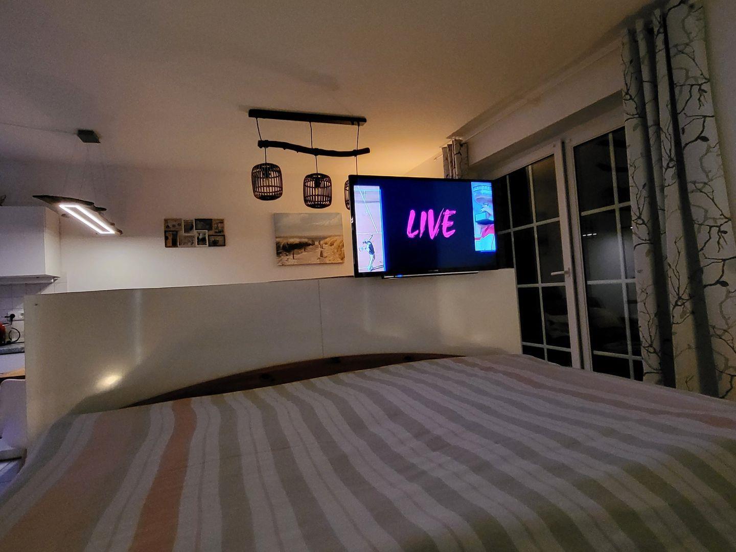 Der Fernseher lässt sich sowohl zu Couch, als auch zum Bett drehen.