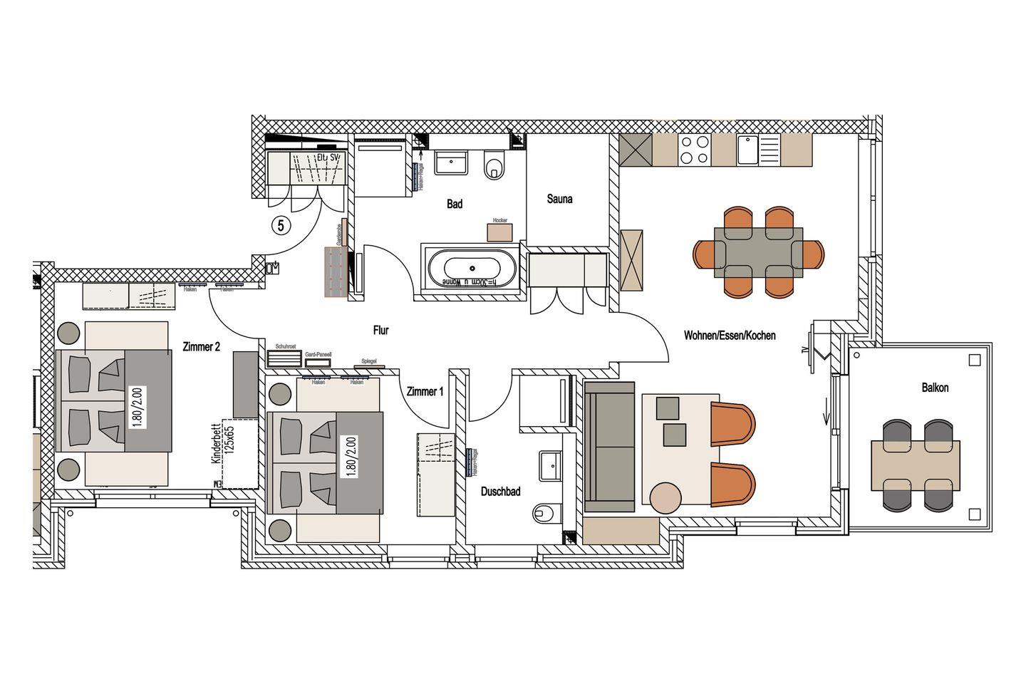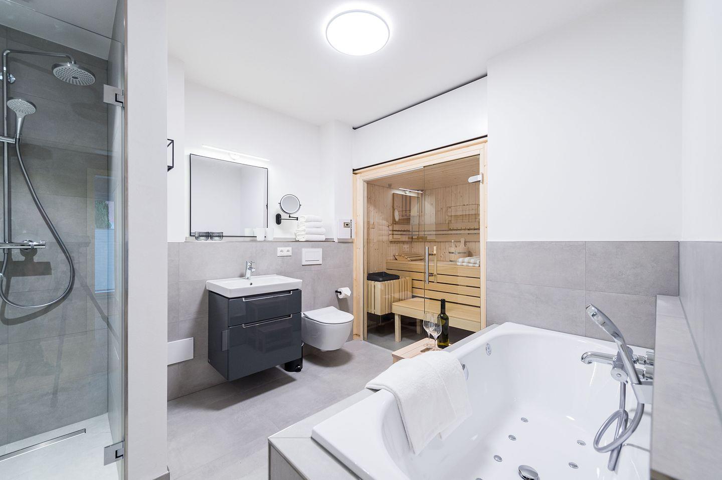 Sie ist für bis zu 4 Personen (der angegebene Preis bezieht sich immer auf 2 Erwachsene und 2 Kinder, extra Personen können ggf. auf Anfrage dazu gebucht werden) buchbar (2 Schlafzimmer mit Doppelbetten 180 x 200 cm) und verfügt über eine gehobene 5-Sterne-Ausstattung: 2 Badezimmer, 1 Sauna, 1 Whirlwanne sowie 1 Balkon (frontaler Meerblick). Die Küche ist komplett ausgestattet und bietet einen großen Esstisch für bis zu 6 Personen. Zudem gibt es einen Geschirrspüler, einen Kühlschrank inkl. Gefrierfach, eine Mikrowelle sowie einen Waschtrockner. Im Wohnbereich erwartet