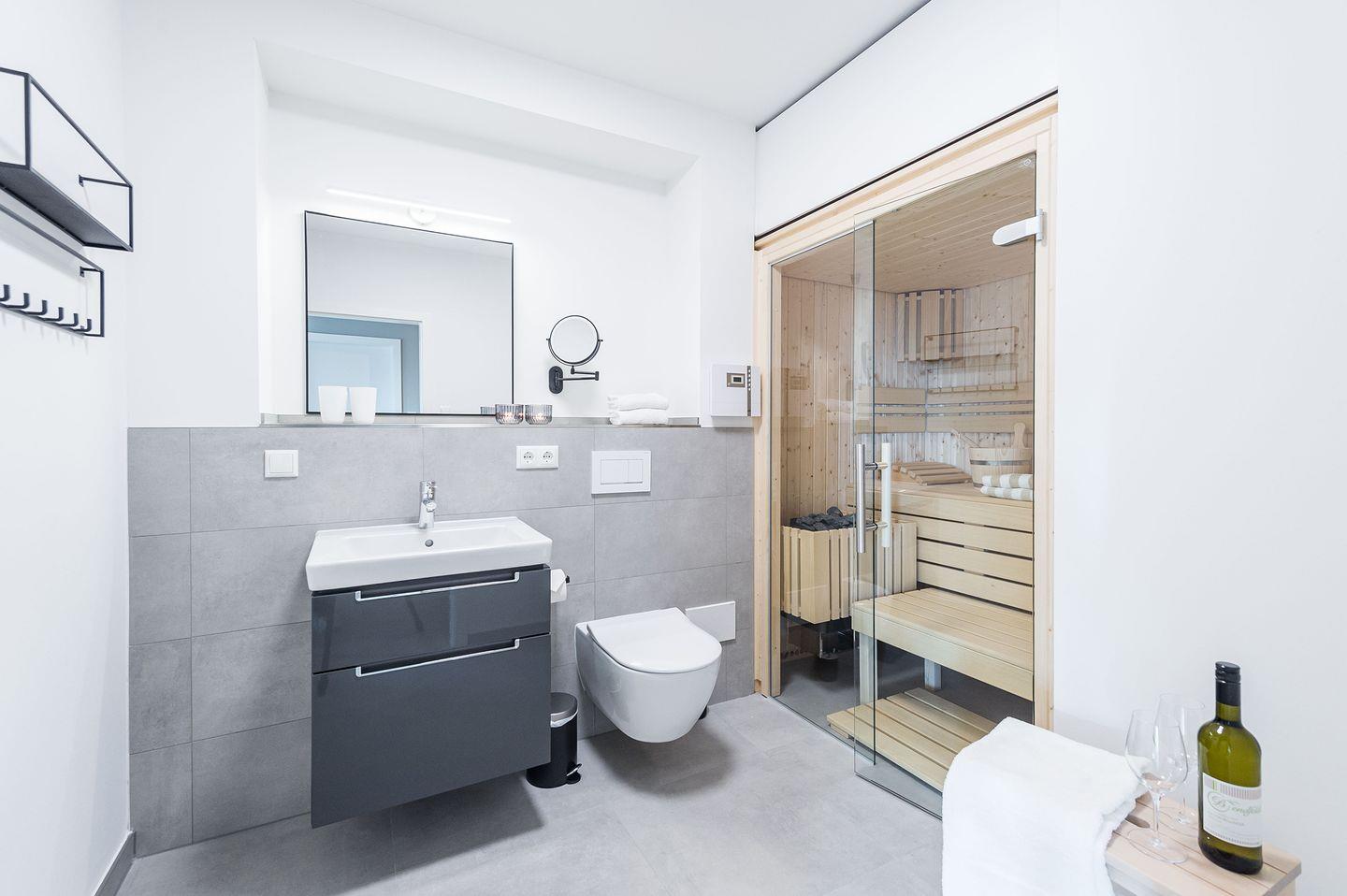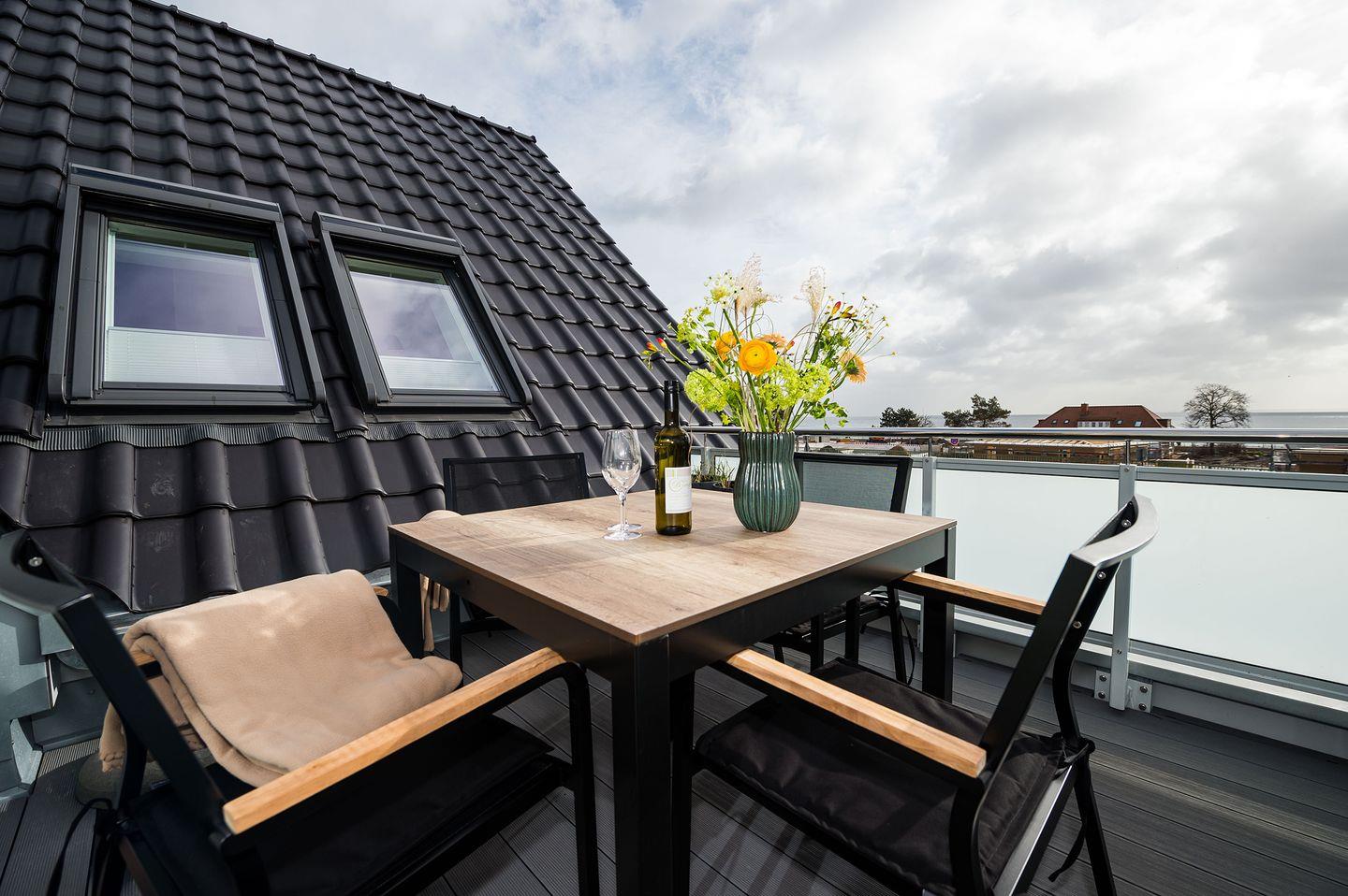 Moderne Luxusferienwohnung mit Meerblick, Sauna und Terrasse in Grömitz, nur 100 m vom Strand entfernt.