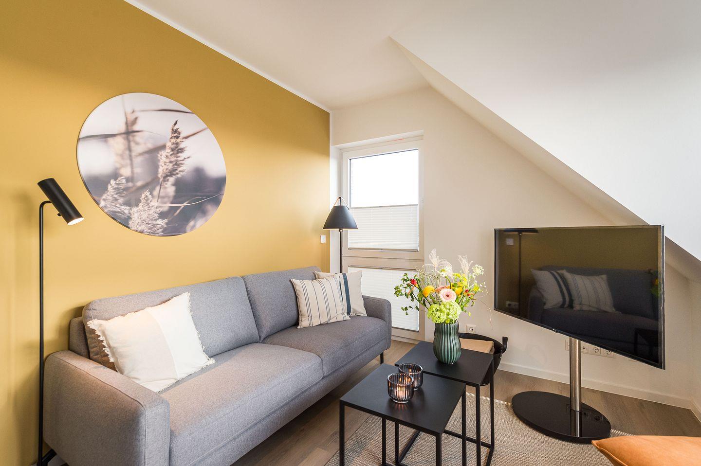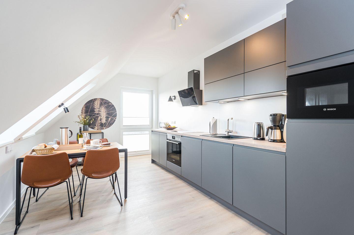 Sie ist für bis zu 2 Personen buchbar (1 Schlafzimmer mit Doppelbett 180 x 200 cm) und verfügt über eine gehobene 5-Sterne-Ausstattung: 1 Badezimmer, 1 Sauna sowie 1 Dachterrasse (frontaler Meerblick). Die Küche ist komplett ausgestattet und bietet zudem einen Esstisch für bis zu 4 Personen. Zudem gibt es einen Geschirrspüler, einen Kühlschrank inkl. Gefrierfach, eine Mikrowelle sowie einen Waschtrockner. Im Wohnbereich erwartet Sie ein 50-Zoll-Smart-TV sowie der Zugang zur Dachterrasse. Die Dachterrasse ist ebenfalls mit einem Esstisch ausgestattet und bietet einen herrlichen, frontalen Blick auf die Ostsee. Selbstverständlich bieten wir schnelles und kostenfreies WLAN sowie einen PKW-Stellplatz direkt am Haus. Auf den hauseigenen Parkplätzen stehen Ihnen E-Auto-Ladegeräte (Wallboxen) zur Verfügung (gegen Gebühr). Aufgrund der Allergiker gerechten Ausstattung sind Haustiere nicht erlaubt.