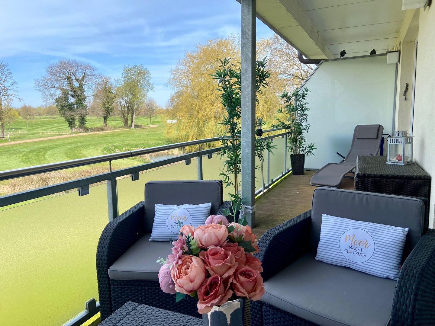 Moderne Ferienwohnung in Grömitz mit Schwimmbadnutzung und Blick auf Golfplatz und Natur, ideal für Ruhe und Erholung.