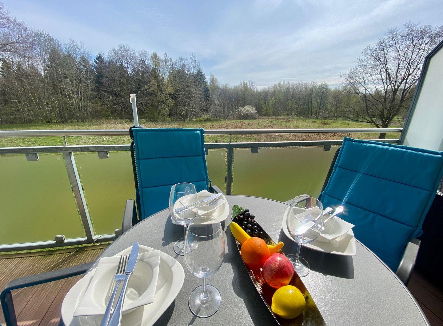 Das helle, elegante Schlafzimmer hat ein Doppelbett (2 x 90x200 cm) mit einem großen Kleiderschrank und Zugang zum Balkon zur Ostseite, auf der Sie schon morgens gemütlich eine Tasse Kaffee in der Sonne trinken können. Die voll ausgestattete Küche mit einem "Vita fresh" - Kühlschrank, Backofen und Mikrowelle ist zum Essbereich offen gestaltet und ein geschmackvoll eingerichteter Wohnraum mit Schlafsofa ( für eine Person geeignet) runden diese Wohnung ab. Der 2. Balkon führt vom Wohnzimmer zur Westseite der Wohnung. Hier genießen Sie die Abendsonne. Von beiden Balkonen haben Sie einen spektakulären Blick in die Natur und auf den Golfplatz.