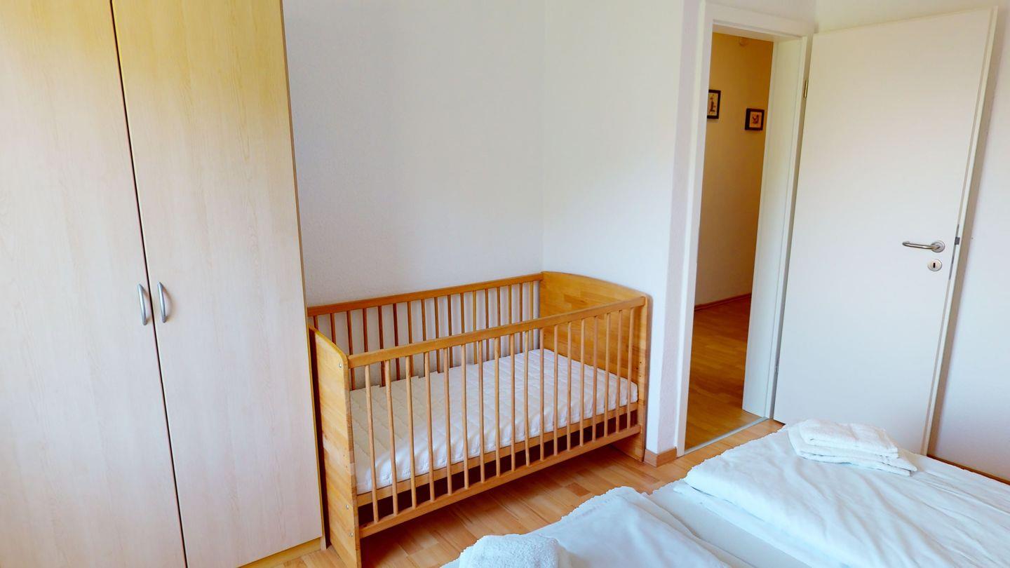 4 Personen finden in dieser Wohnung ausreichend Platz. In einem der Schlafzimmer steht zusätzlich ein Holz-Kinderbett.