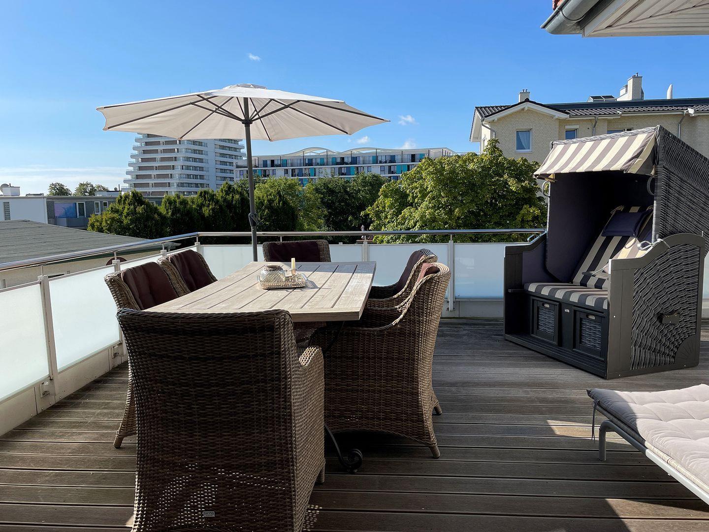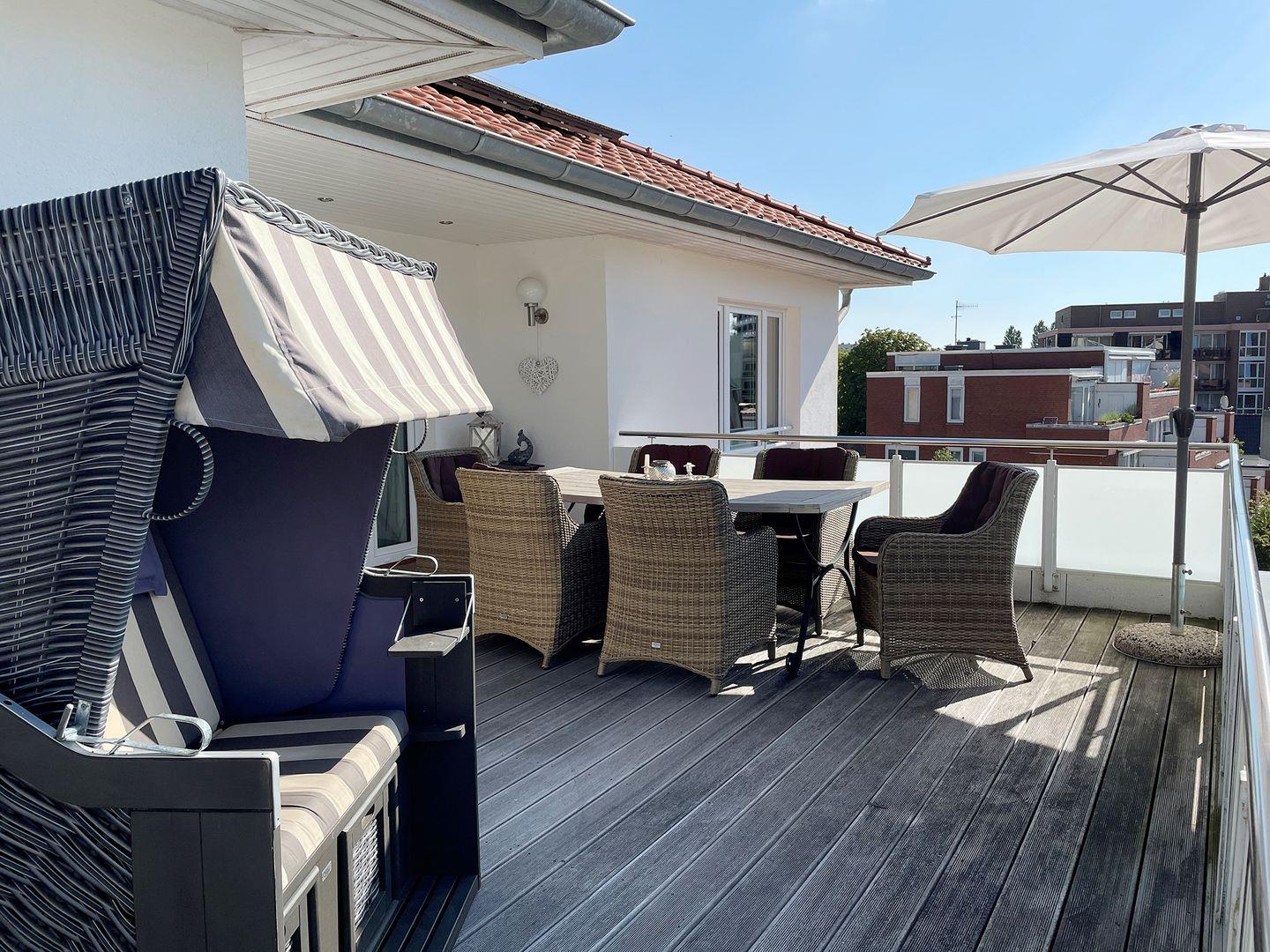 - große Dachterrasse mit Gartenmöbeln und Strandkorb