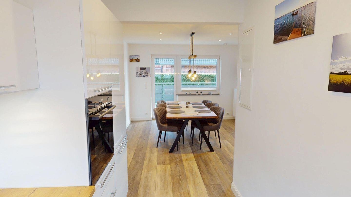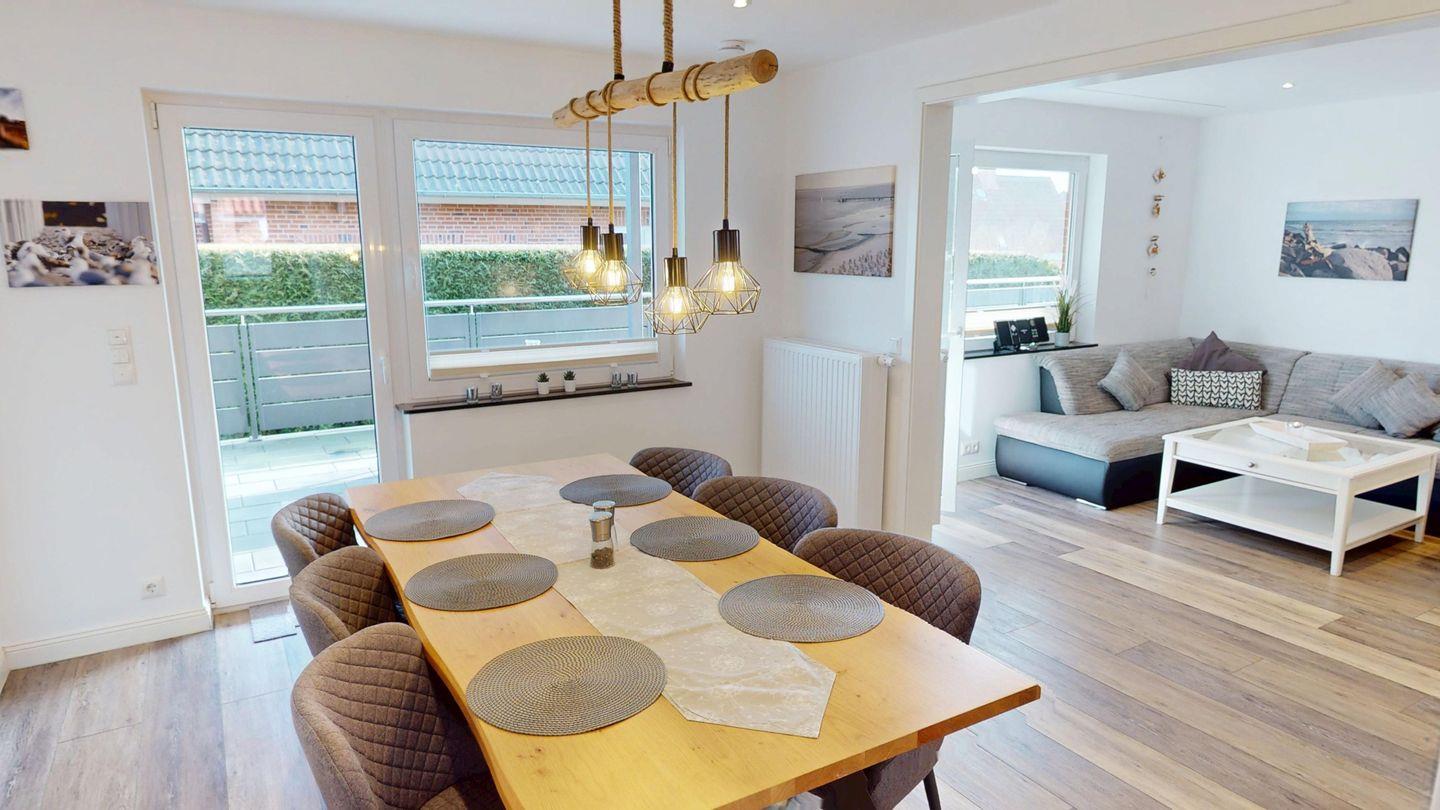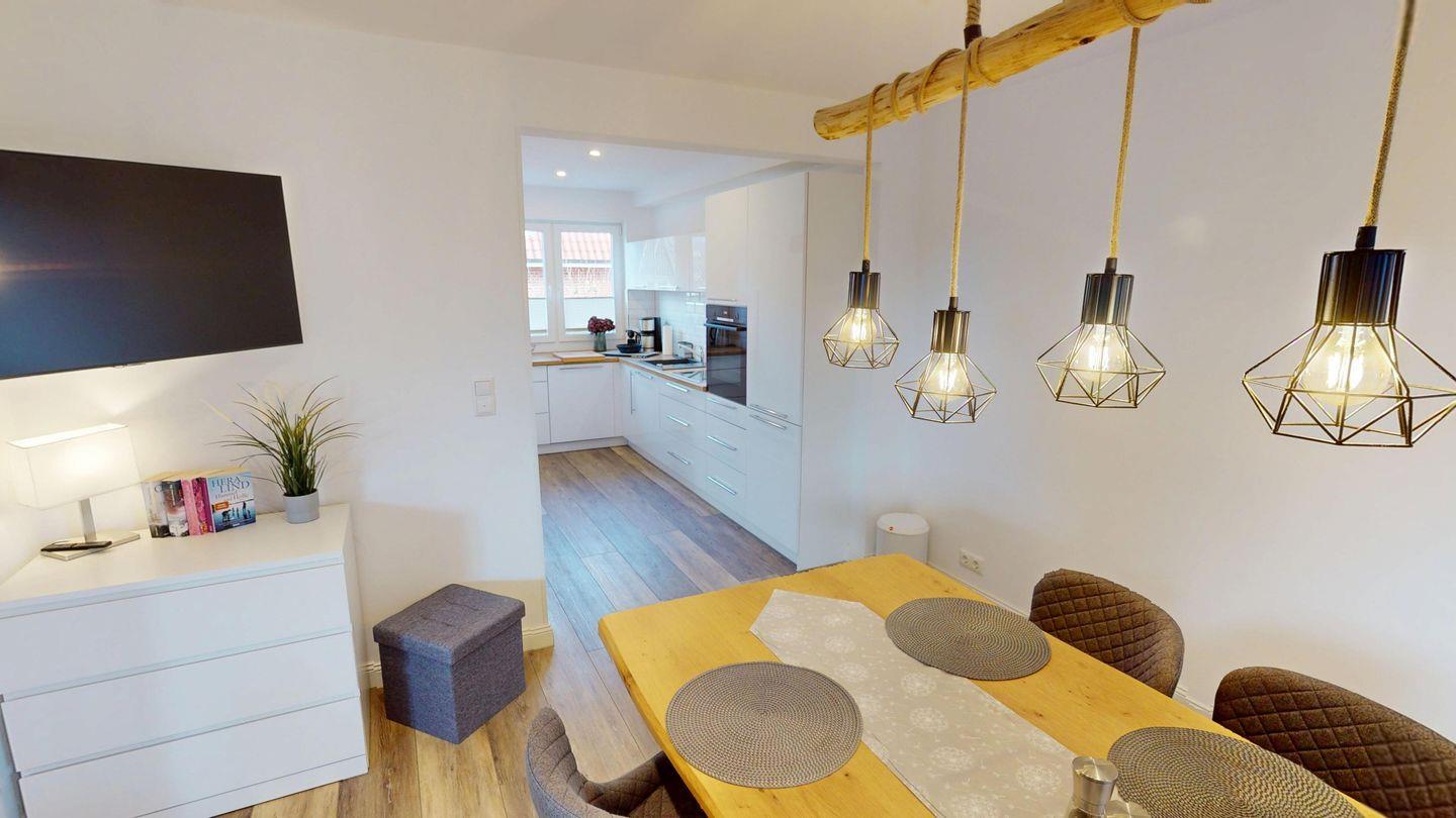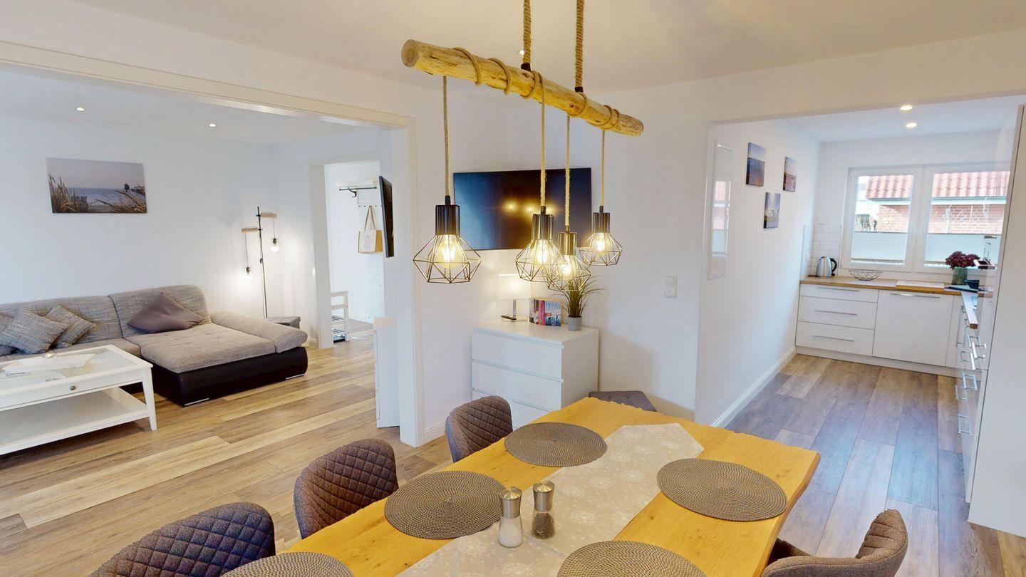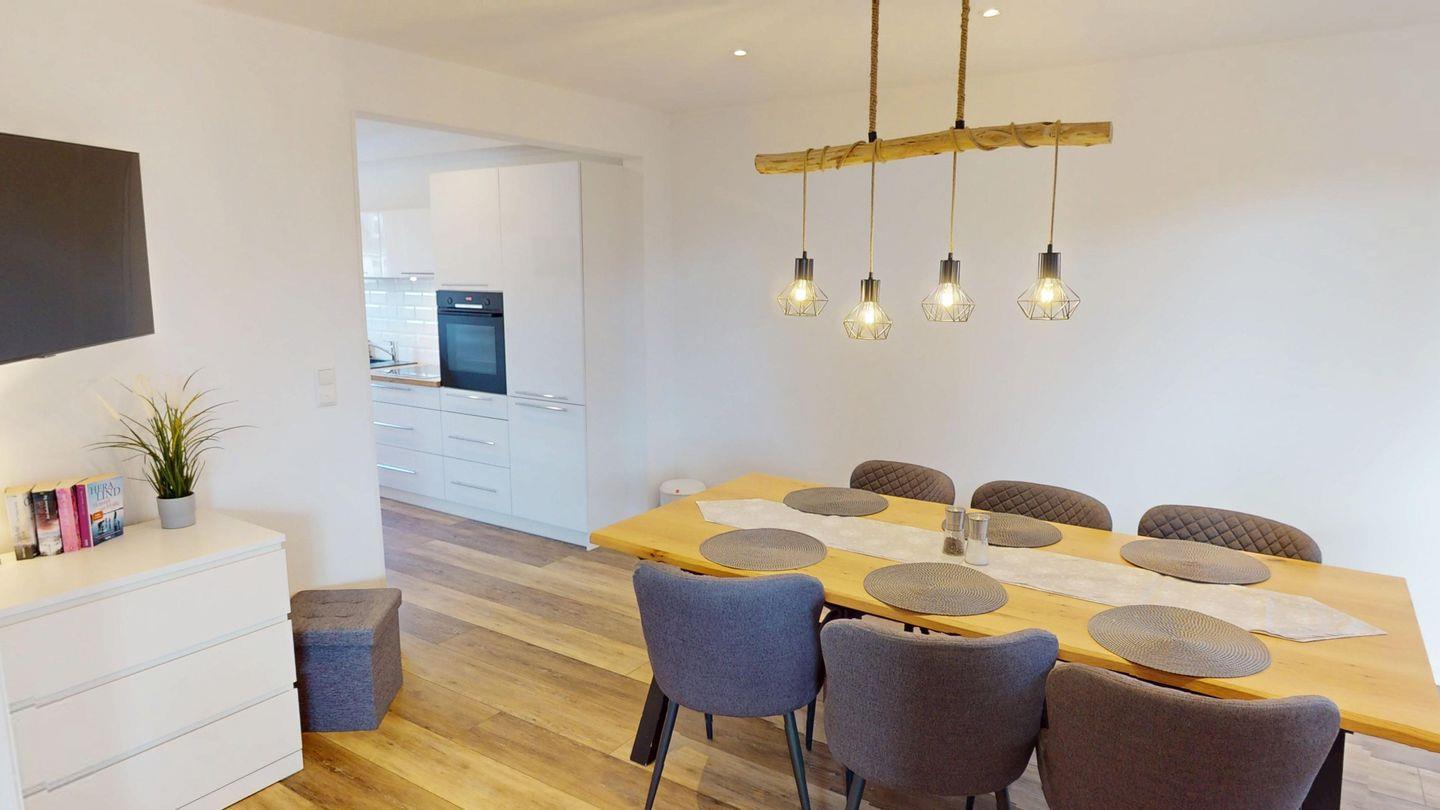 An das Wohnzimmer mit gemütlicher Wohnlandschaft schließt sich der nur leicht abgetrennte Bereich mit Essplatz und voll ausgestatteter Küche an.