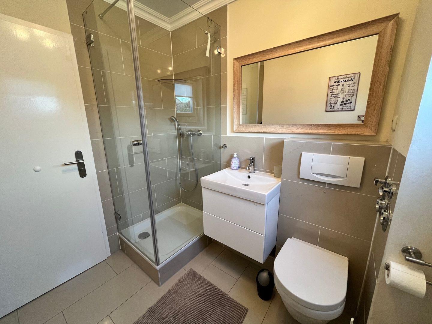 Das Badezimmer hat eine Dusche und ein Fenster. Genügend Ablagefläche finden Sie auch hier, ebenso einen Kosmetikspiegel und einen Fön.