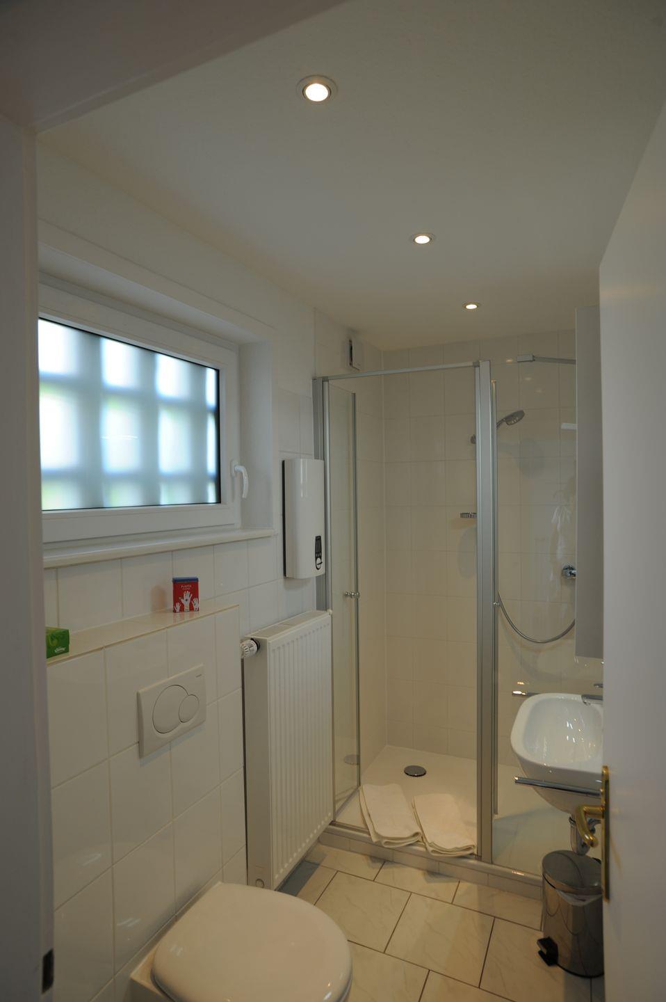 Das Duschbad enthält neben dem Waschbecken und dem WC eine großflächige Dusche. Vor diesem Raum befindet sich ein Einbauschrank mit Gerätschaften z. B. Föhn, Bügeleisen usw.