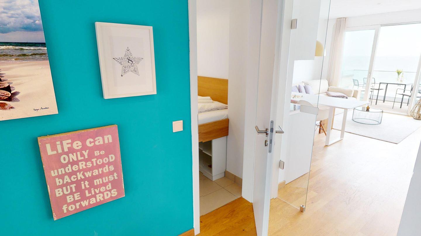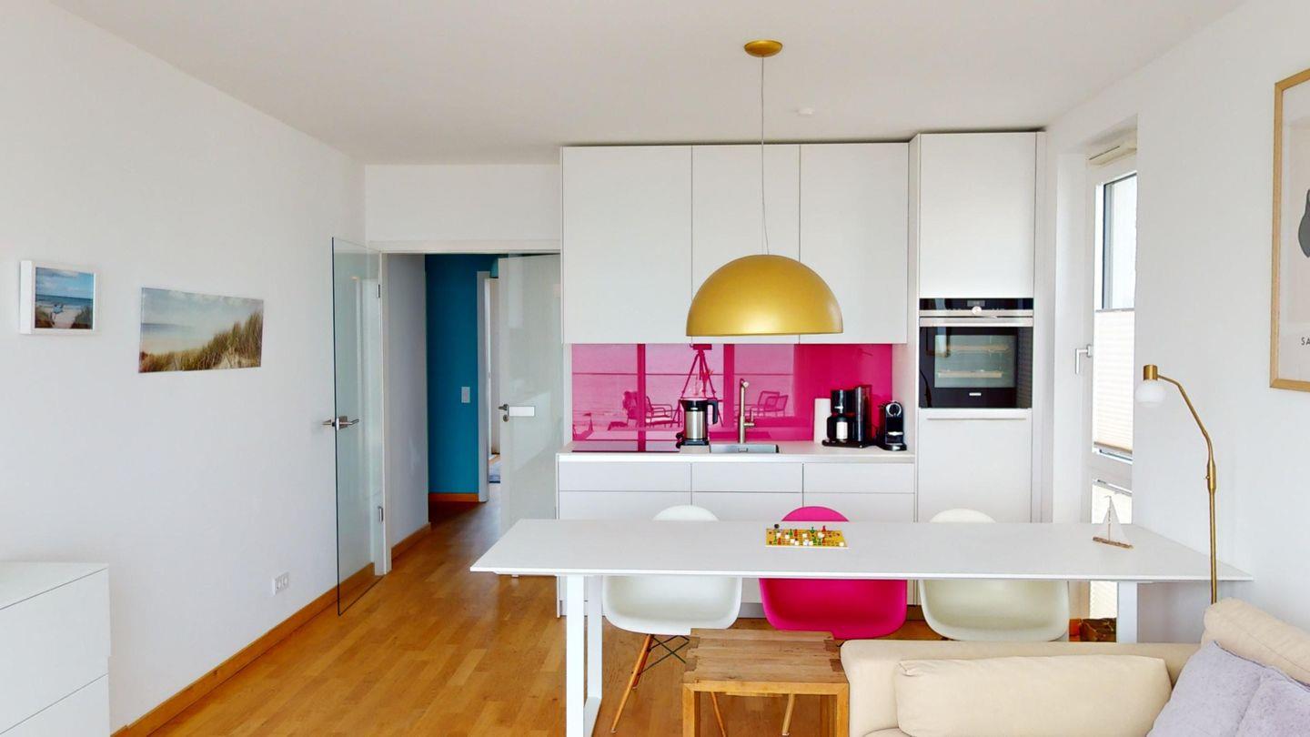 Der helle, gemütliche Wohnraum mit Küchenzeile und De Longhi-Kaffeepadmaschine sowie der fantastische Meerblick begeistert alle! Die Promenade mit der Surfschule sowie der Yachthafen sind direkt vor dem Haus.