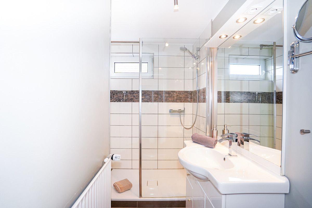 In der ersten Etage befinden sich ein großes Schlafzimmer mit einem direkten Zugang zur schönen Dachterrasse, ein modernes Duschbad mit großer Echtglasdusche und ein separates WC.