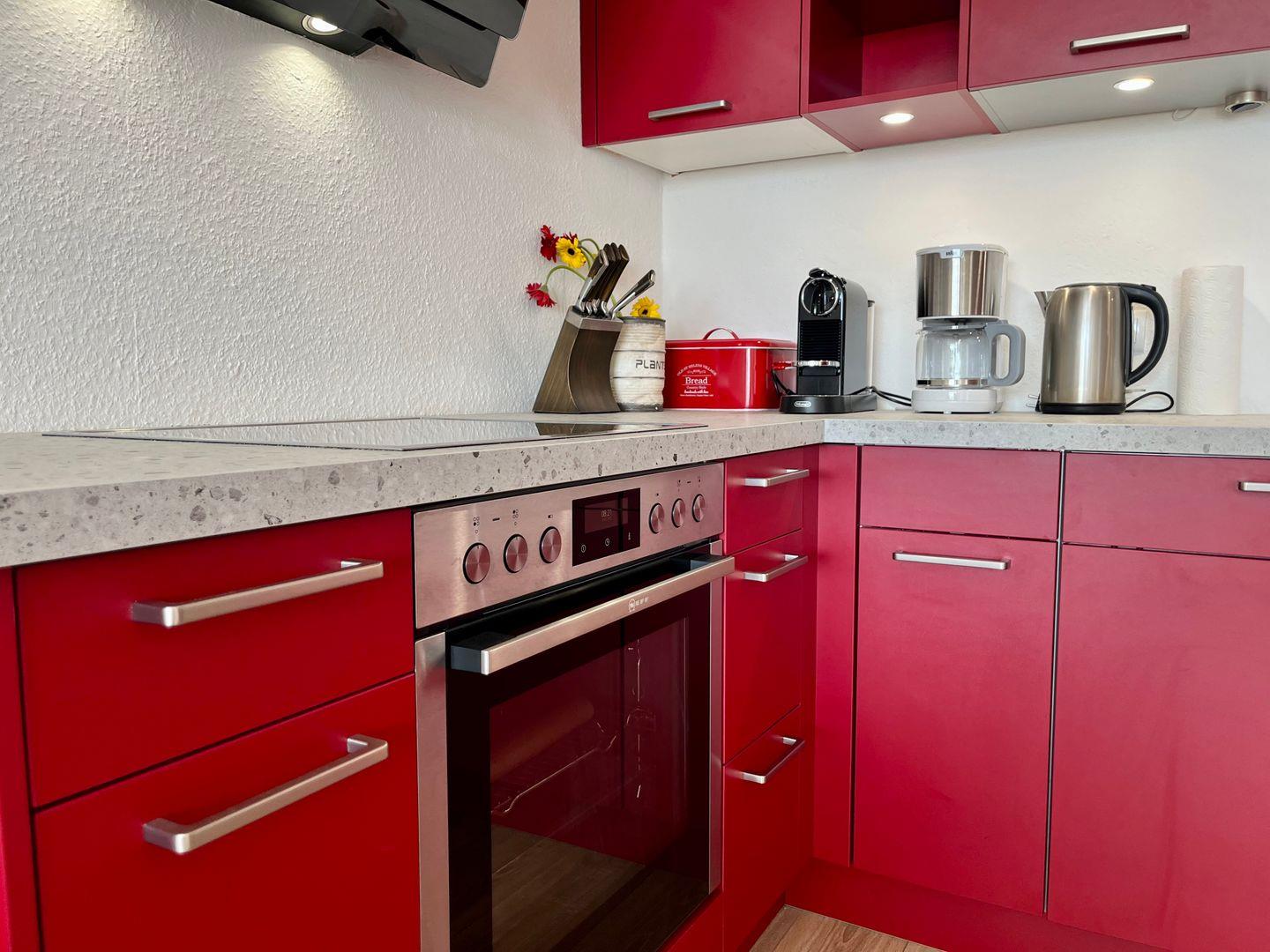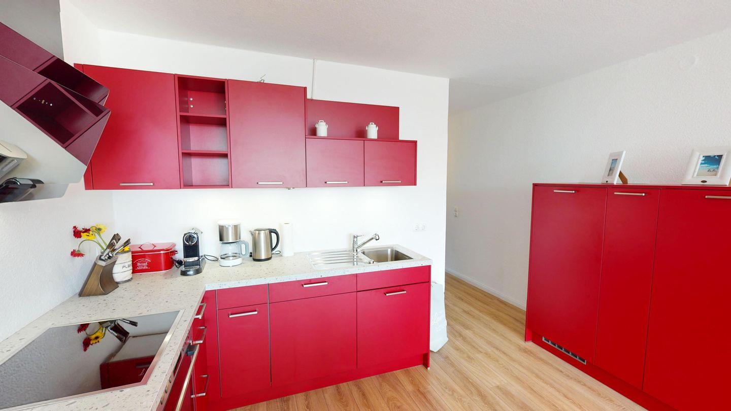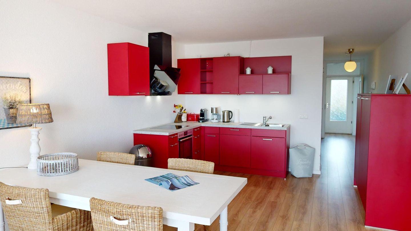 Das Apartment bietet Platz für 2 Erwachsene und 2 Kinder. Durch den Flur gelangen Sie in den offenen Wohn- und Essbereich. Die voll ausgestattete, offene Küche lädt zu geselligen Kochabenden ein. Der Esstisch bietet die Möglichkeit, abends gemütlich zusammenzusitzen. Im Wohnbereich finden Sie neben einem Sessel einen modernen Flachbildfernseher, der auch an Regentagen für Gemütlichkeit und Unterhaltung sorgt.