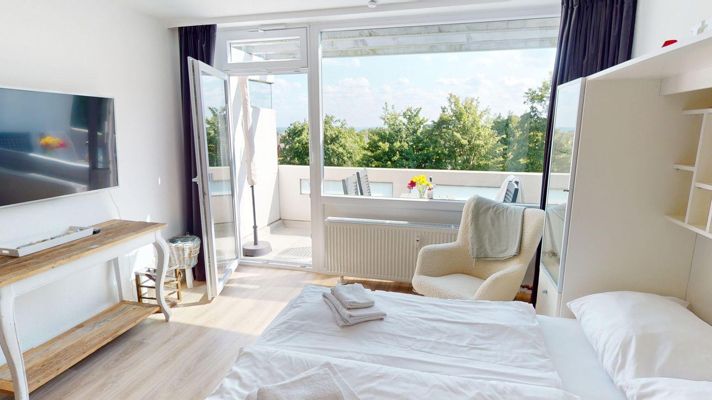Stilvolle Ferienwohnung in Grömitz mit Panorama-Meerblick, Balkon und Strandkorb für entspannte Urlaubstage.