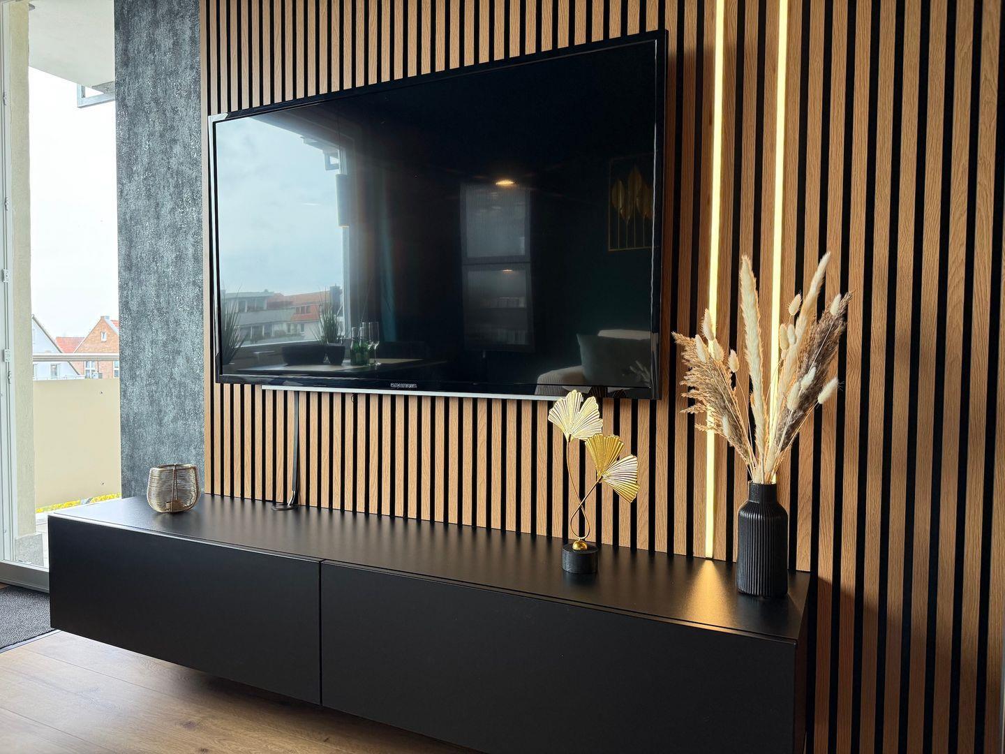 Das Wohnzimmer ist mit einer sehr modernen Schlafcouch in grob Cord (mit Lattenrost und Matratze) ausgestattet, sowie einem Esstisch für 2 Personen und einem 55" Zoll Flachbildfernseher inkl. Amazon Fire TV-Stick (kein Account inklusive).
