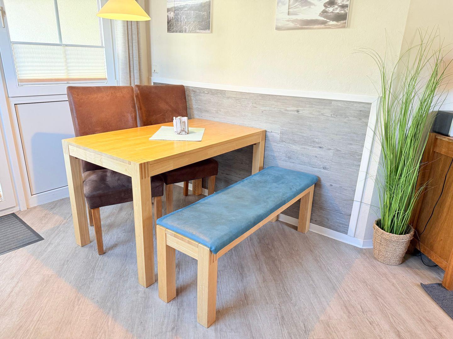 Der gemütliche Wohn- und Essbereich bildet das Herzstück der Ferienwohnung. Hier lässt sich´s abends einen gemütlichen Fernsehabend auf dem Sofa verbringen und wenn Sie zu Fünft anreisen, kann man das Sofa ganz einfach zum Bett umfunktionieren.