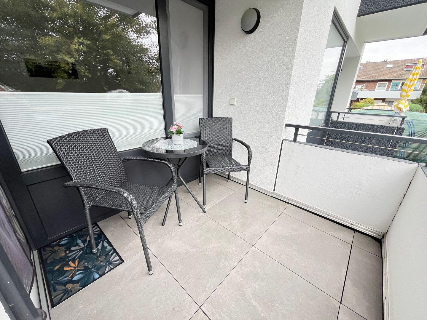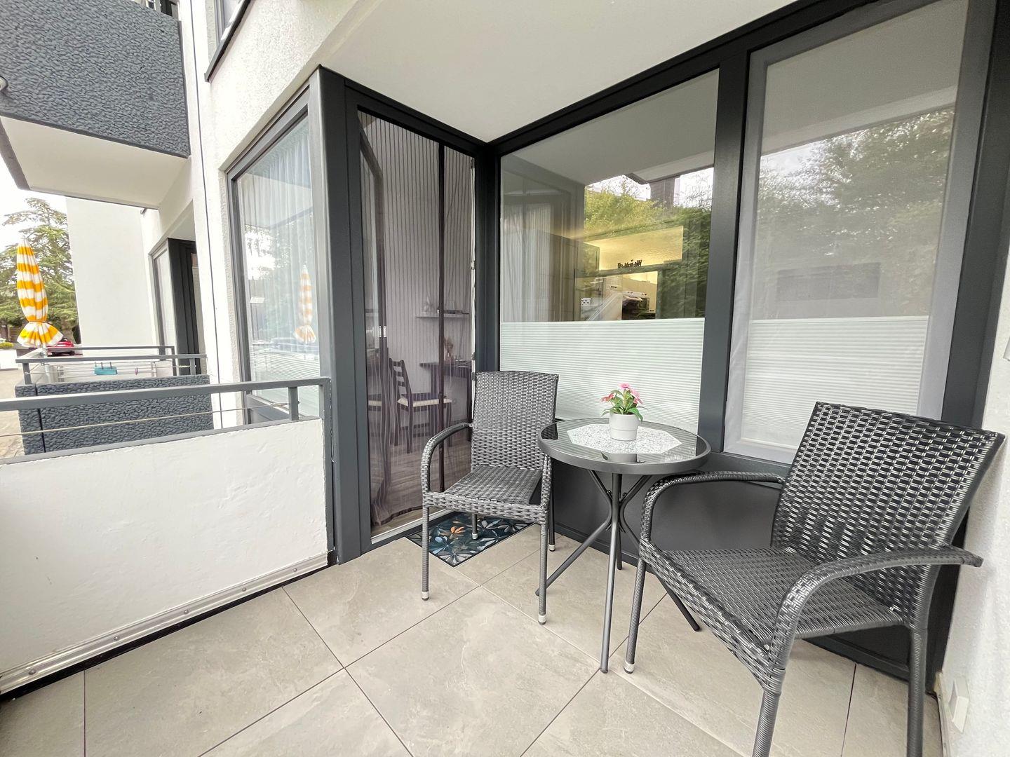 Trinken Sie doch Ihren frischen Morgenkaffee auf dem möblierten, ostseitigen Balkon mit Sonnenschirm. Der schnelle und stabile WLAN-Anschluss ist inklusive.