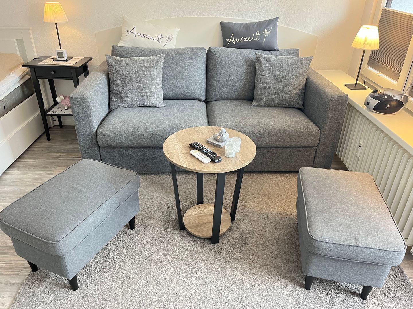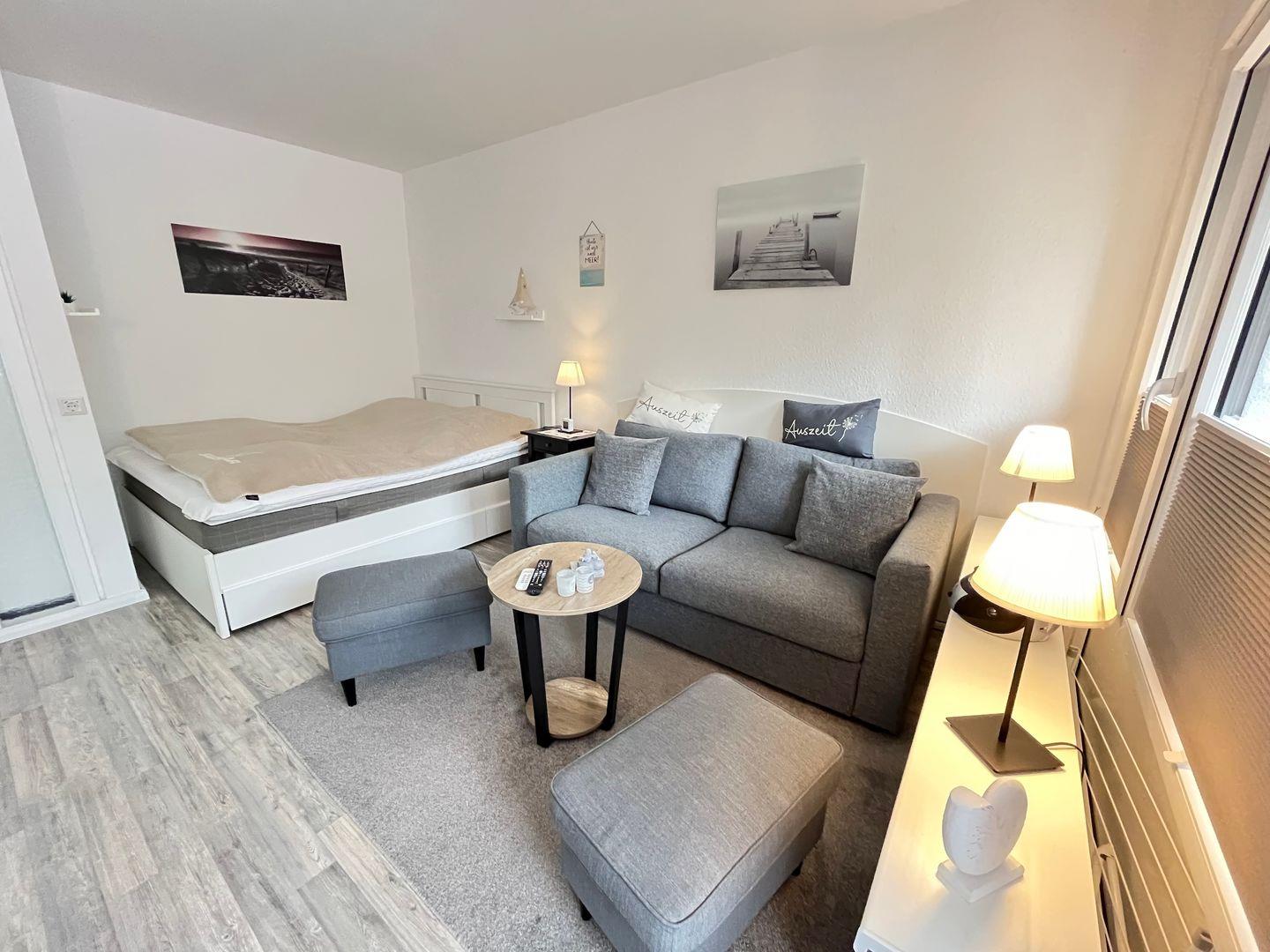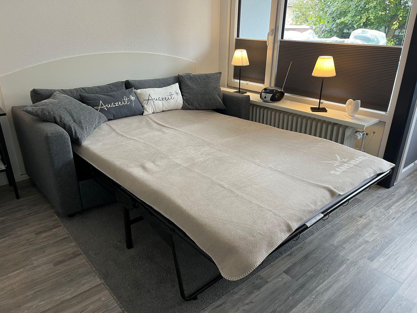 Der Wohn- und Schlafbereich bildet das Herzstück dieser Hochparterre-Wohnung und lädt zu gemütlichen Stunden auf dem Schlafsofa (140x200 cm) ein. Zur Nachtruhe ist ein kuscheliges Doppelbett (160x200 cm) mit einem hochwertigen Topper in einer Nische vorhanden. Im Wohn- Schlafbereich befinden sich Verdunklungsplissees. Ein Smart-TV, Radio und CD-Player sorgen für Unterhaltung.