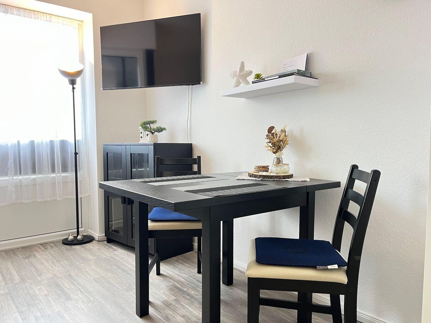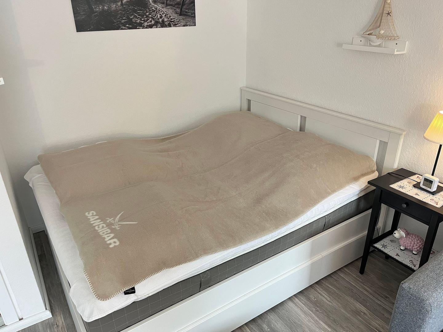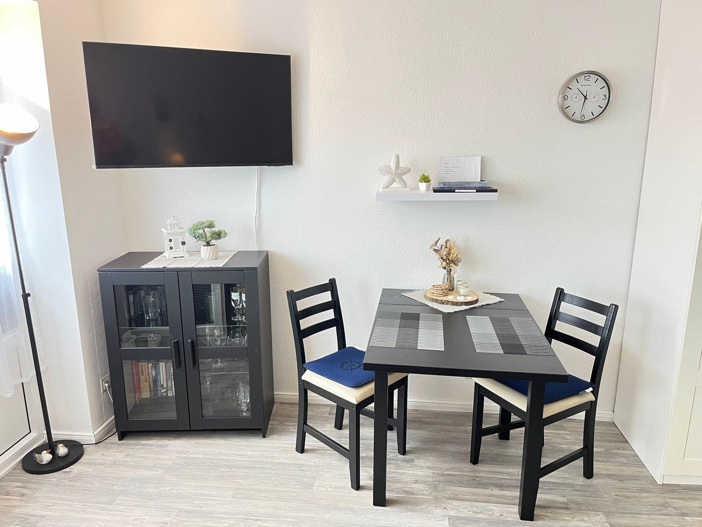 Der Wohn- und Schlafbereich bildet das Herzstück dieser Hochparterre-Wohnung und lädt zu gemütlichen Stunden auf dem Schlafsofa (140x200 cm) ein. Zur Nachtruhe ist ein kuscheliges Doppelbett (160x200 cm) mit einem hochwertigen Topper in einer Nische vorhanden. Im Wohn- Schlafbereich befinden sich Verdunklungsplissees. Ein Smart-TV, Radio und CD-Player sorgen für Unterhaltung.
