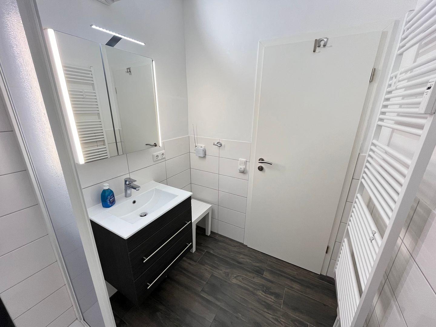 Das innenliegende Badezimmer überzeugt mit luxuriöser Regendusche mit bodentiefem Einstieg, WC, Handtuchheizung und Fön. Es ist elegant und modern gestaltet. Natürlich können Sie auch in dieser Wohnung die gute Ostseeluft genießen.